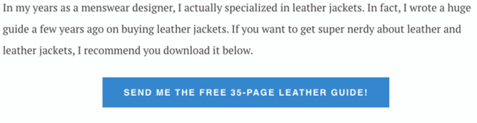One of his highest-performing blog posts is called “How to Buy Your First Leather Jacket.” On its own, this is a good piece of content. But look at what Nguyen offers in the middle of the post.