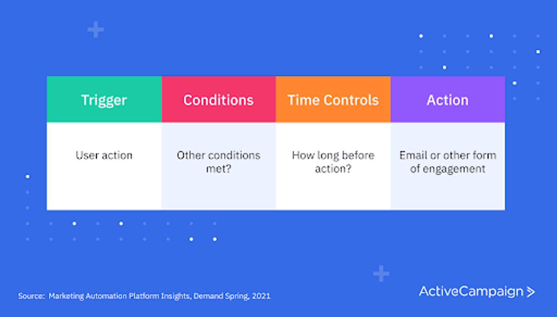 Conditions are characteristics that must be in place for the system to complete the triggered action. For example, personalized discounts and special offers are common examples of e-commerce marketing automation.