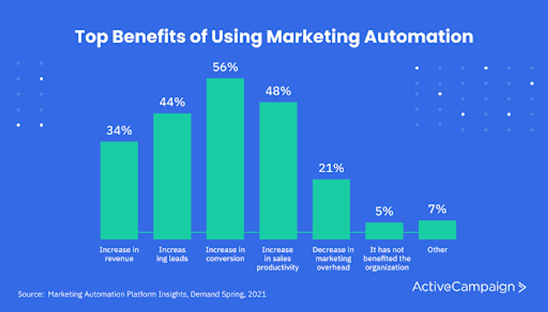 A survey of marketing professionals revealed that, after using marketing automation, 56% saw an increase in conversion rates. Other benefits included increased productivity, increased leads, and increased revenue.