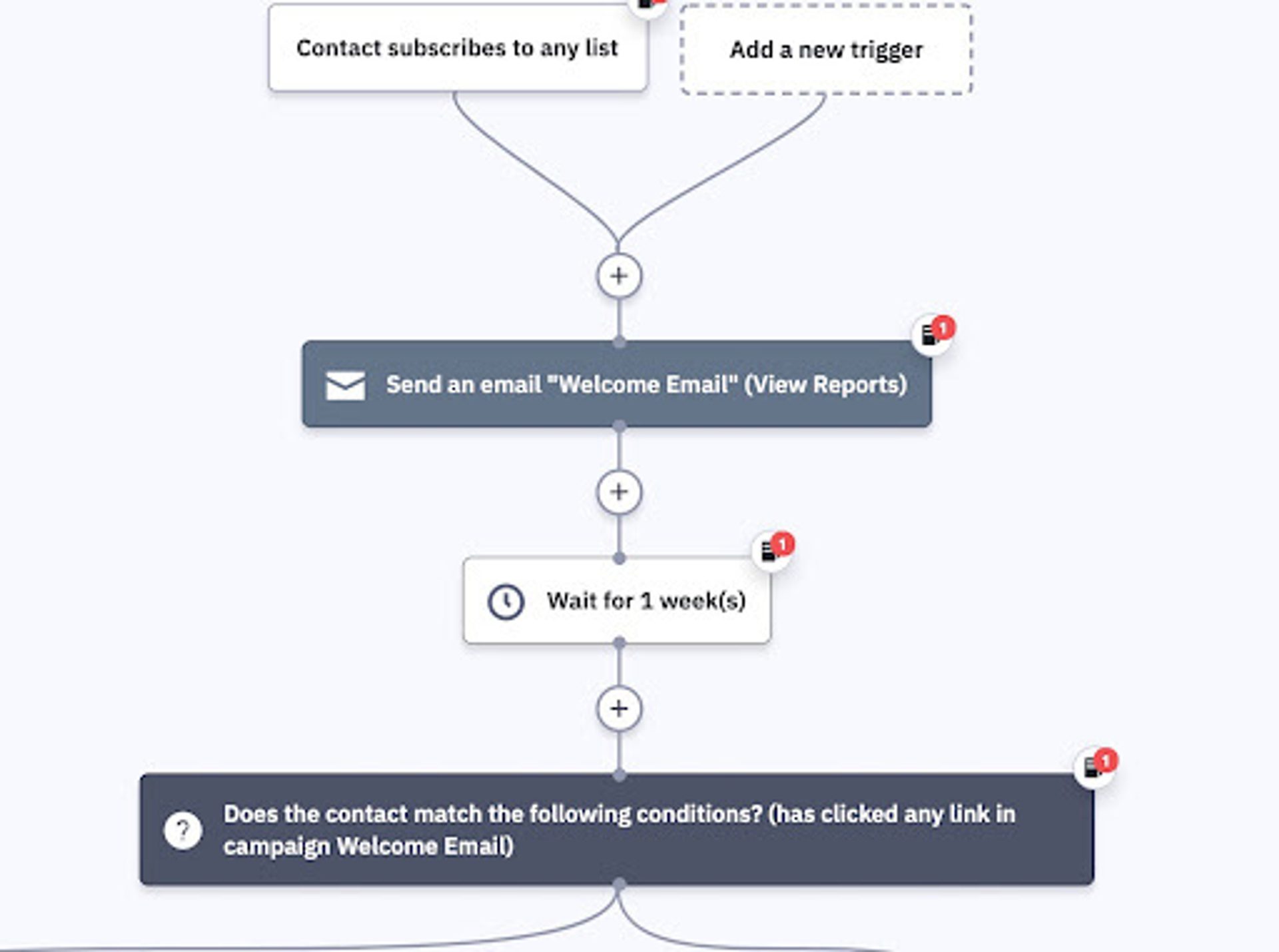 Conditions exist to set guardrails around your automations to make sure an action is only triggered under the right circumstances. Conditions can also serve as a fork in the user’s path. If the condition is met, they receive one message, and if the condition is not met, they receive another.