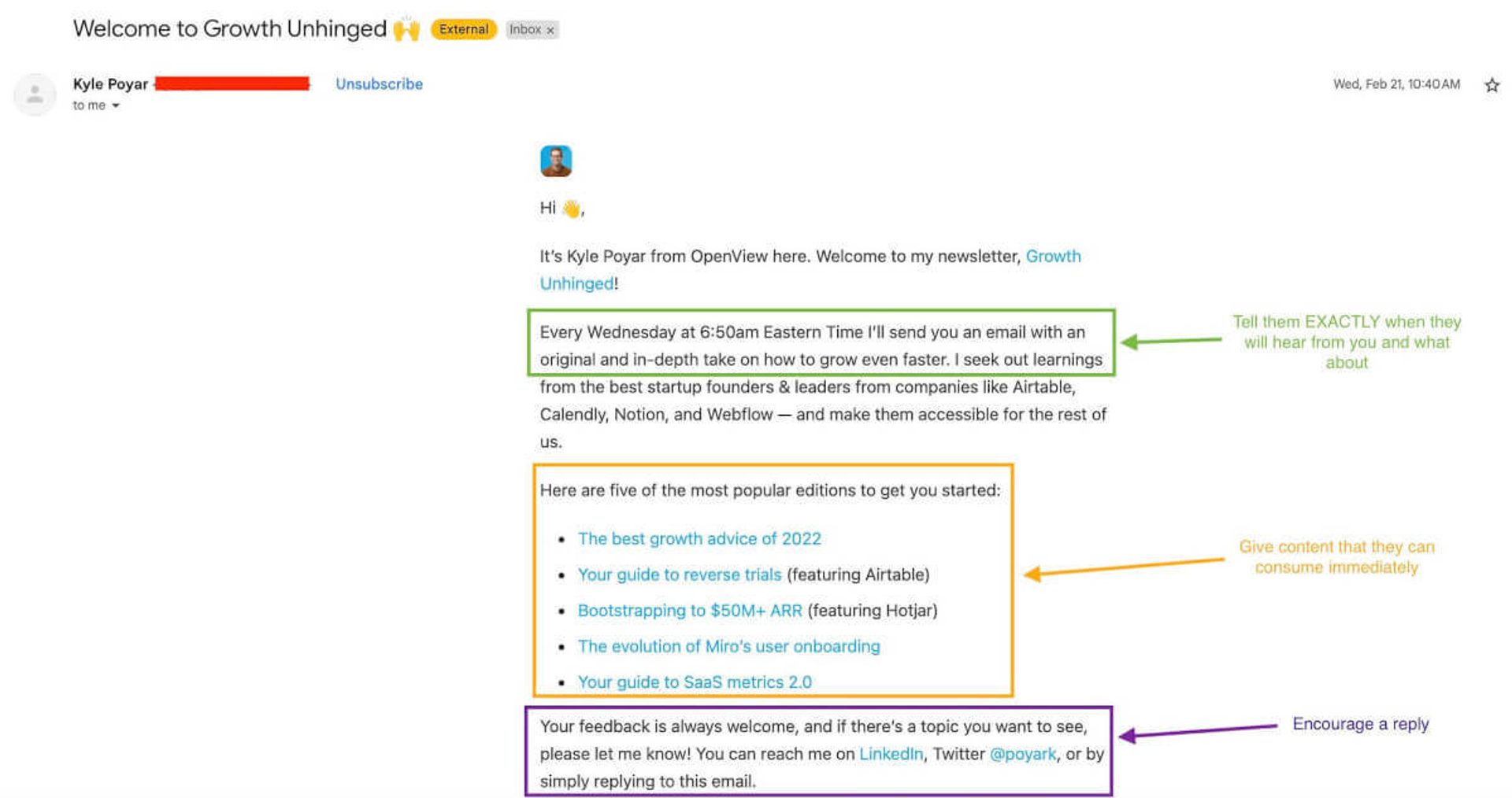 To put these tips into practice, let’s look at an example from Growth Unhinged. Their welcome email does a fantastic job of setting expectations, providing immediate value, and encouraging replies. They clearly outline what subscribers can expect, share top articles, and ask a question to drive engagement.