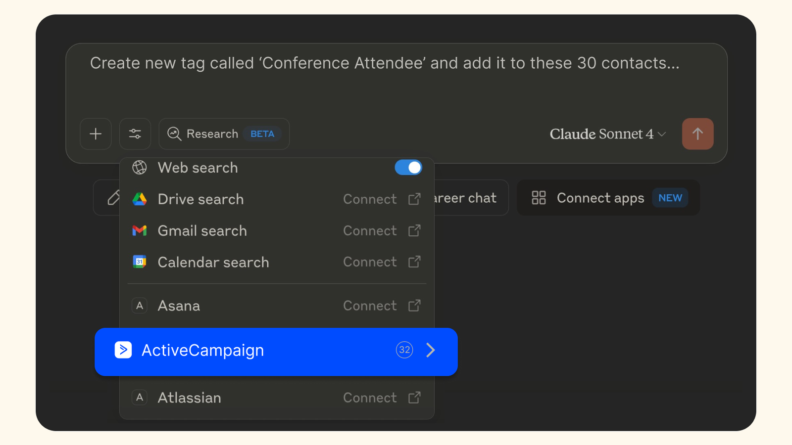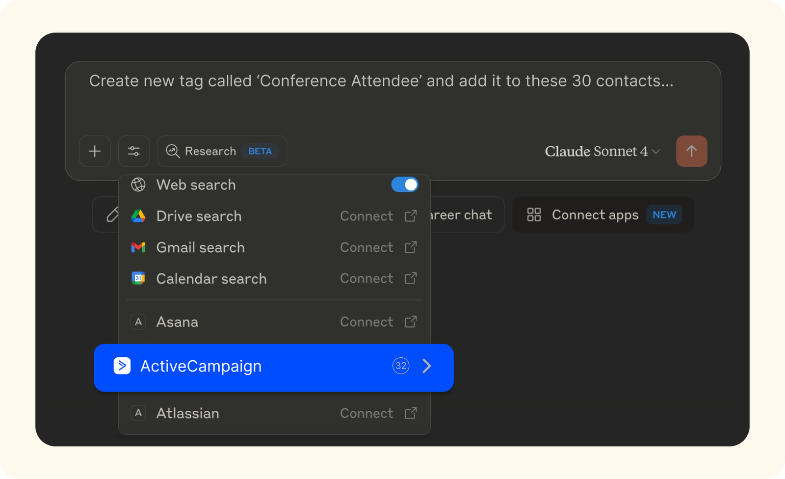 - Cross-platform actions: Combine ActiveCampaign actions with other MCP-enabled platforms