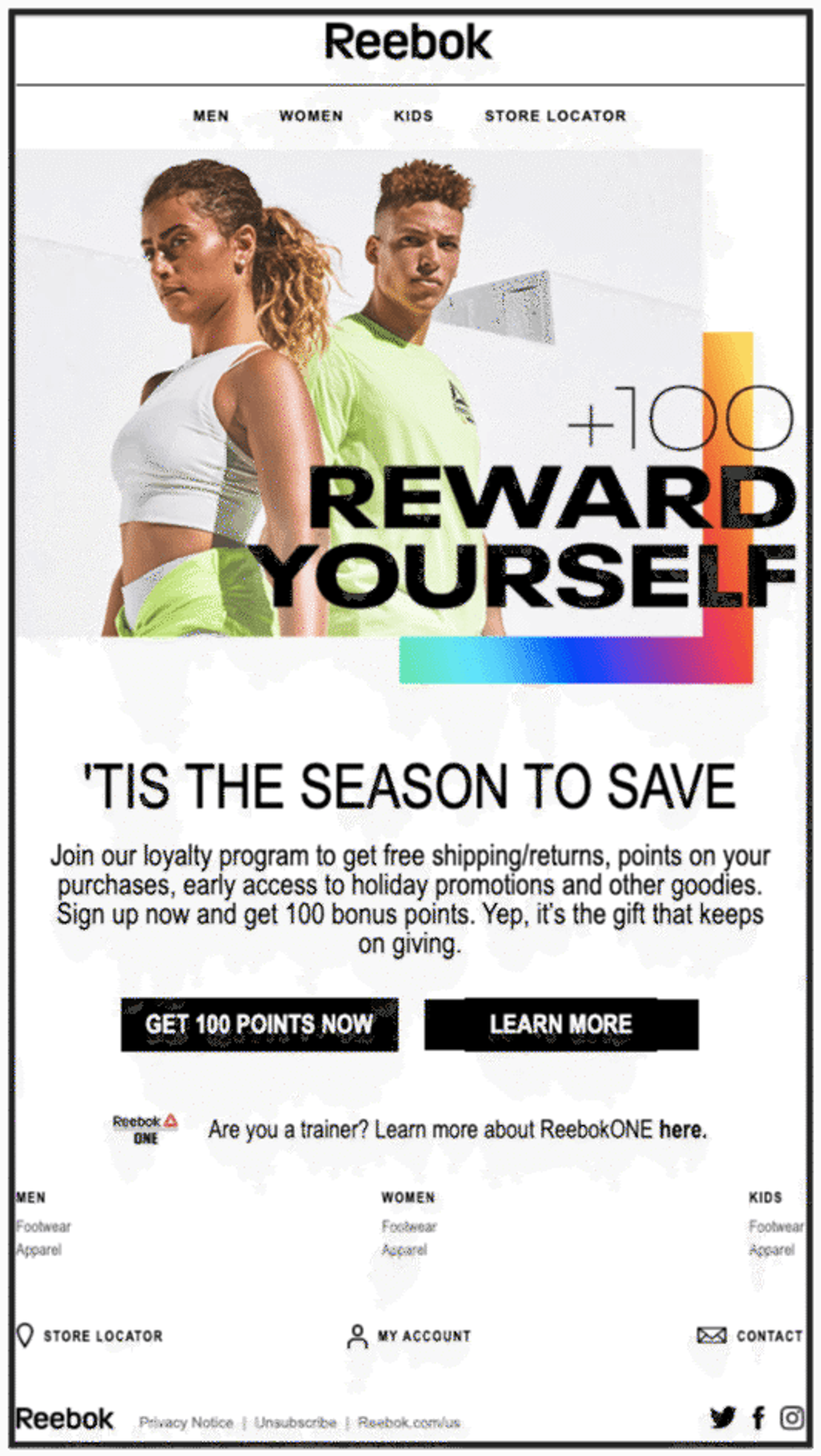 2 clear CTAs give you the choice between an immediate reward, or learning a little more first. Reebok designed this newsletter to do one thing: increase sign-ups for the loyalty and rewards program.