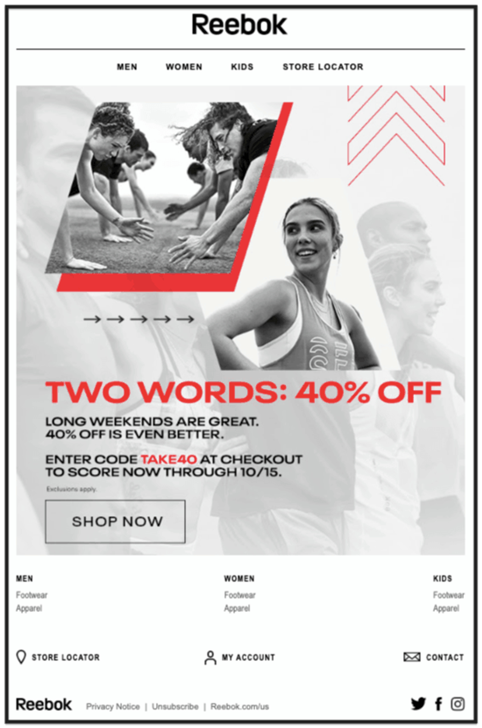 The use of red in an otherwise black and white email directs your eyes to the important stuff: 40% off! Visual hierarchy brings your eyes to the CTA to redeem the offer. Don’t wait, shop now!