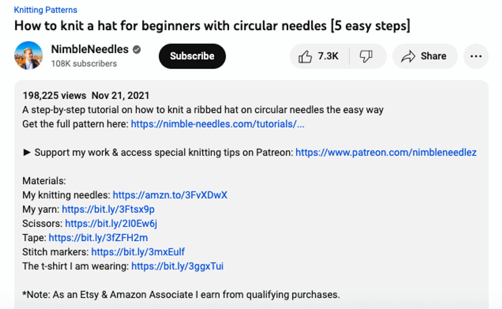 - Involved: When the affiliate promotes products they actually use and vouch for (e.g., a knitter linking to the yarn and needles they used in a YouTube video)