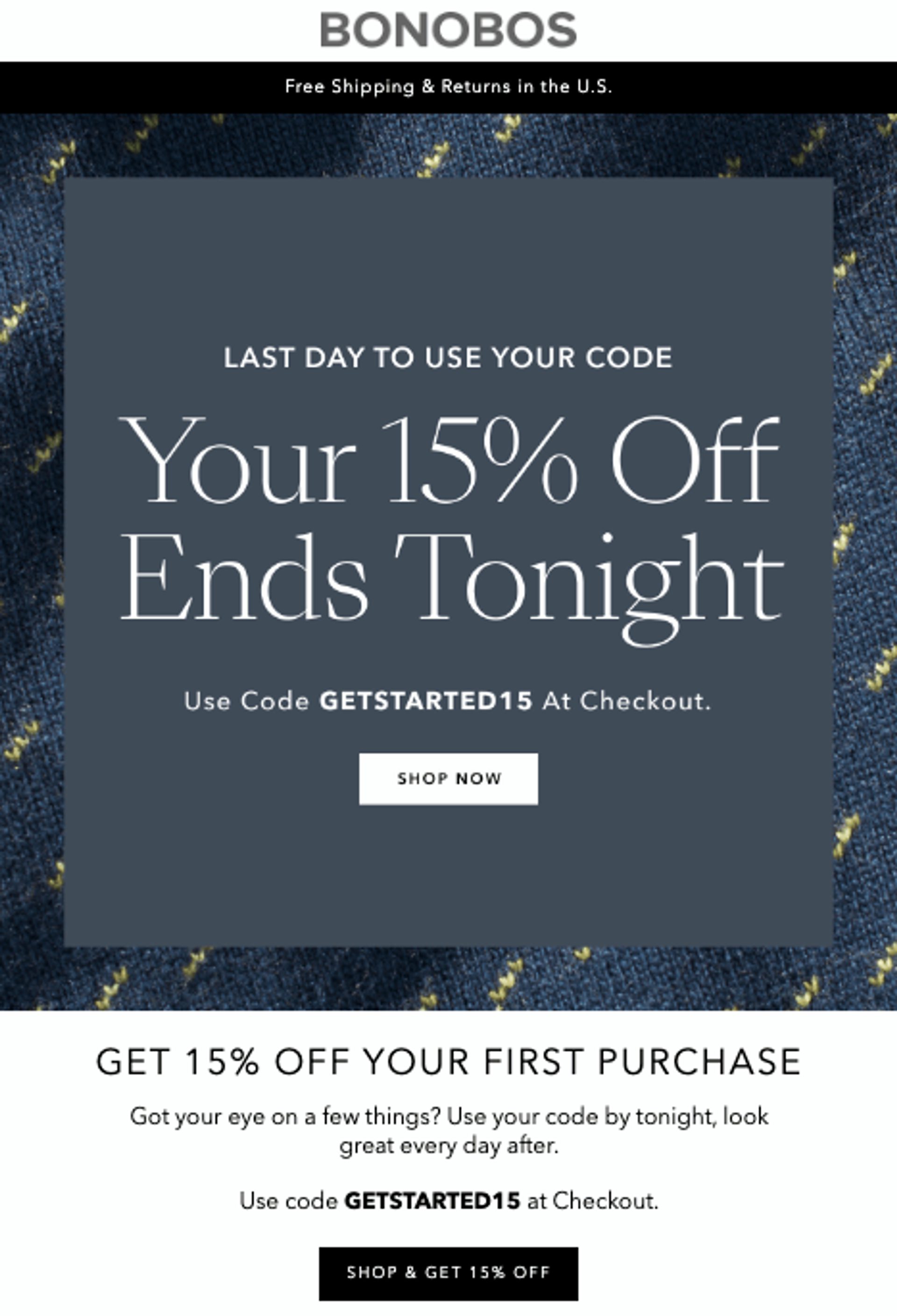 For example, this Bonobos email immediately tells you the most important information (the 15% discount) and gives you a call to action (the “Shop Now” button).