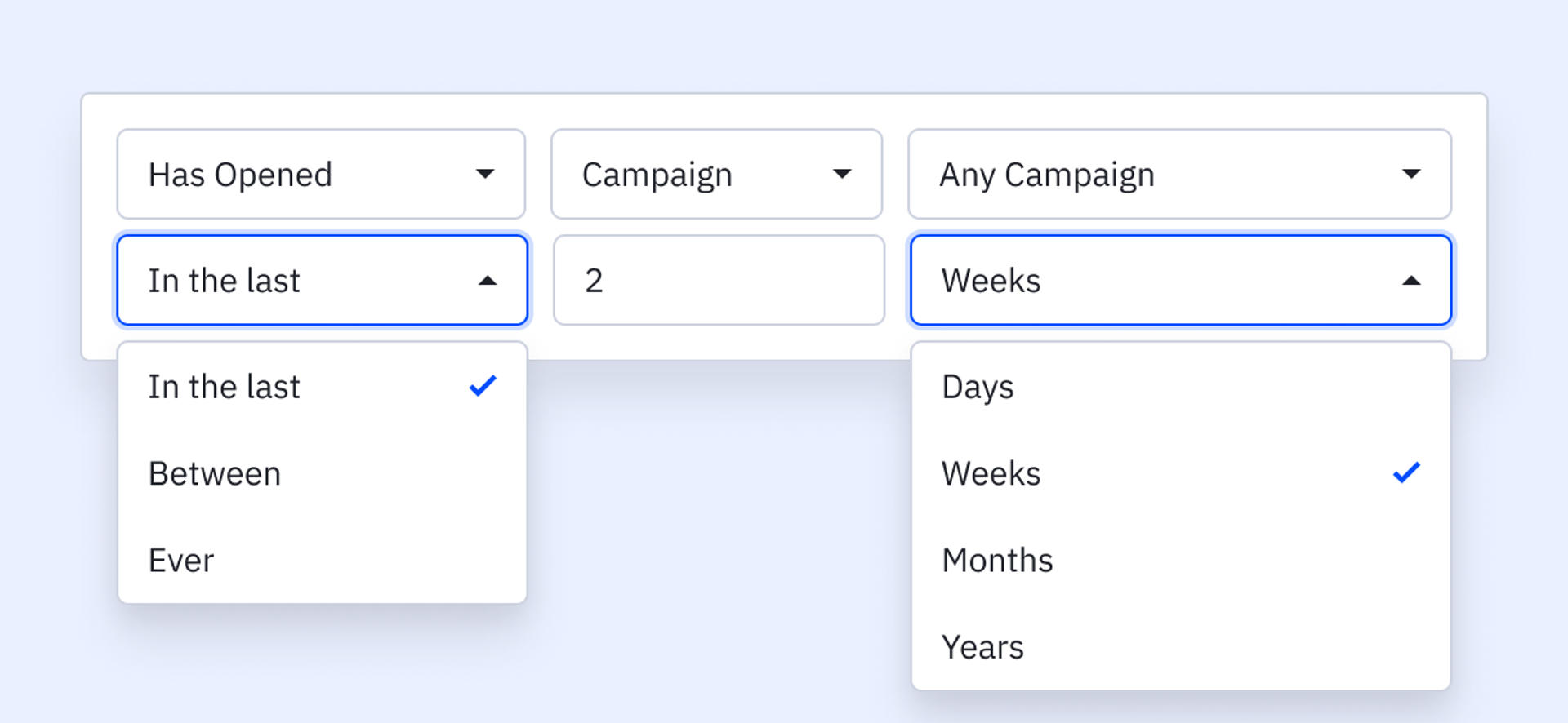 - Email activity windows: Drive engagement by leveraging activity windows on your various email conditions. No more guesswork or relying on tags for increased message relevance. Learn more on how to build out segments using this feature.