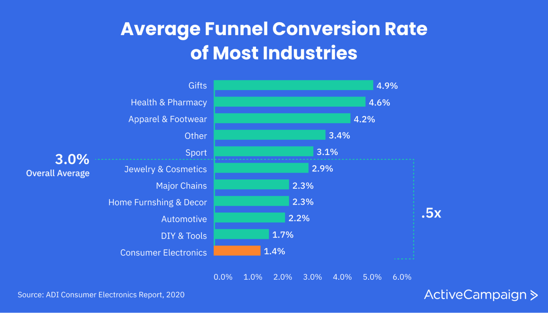 Nearly a third of business owners believe that 3.1%-5% is a reasonable funnel conversion rate. For the most part, this percentage is a good goal to strive toward. According to the Adobe Digital Index 2020 Report Into Consumer Electronics, the average funnel conversion rate in most industries is 3%.