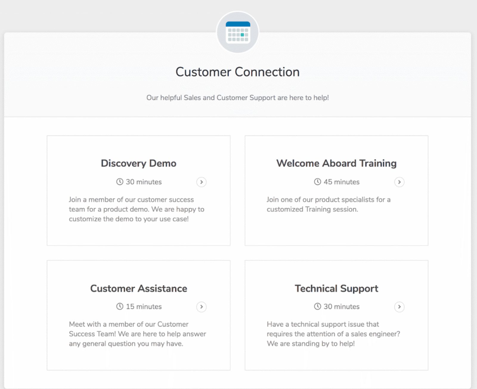 Want to showcase multiple meeting offerings? Create a meeting directory to feature more than one meeting type on a single scheduling page. For example, as a marketer, you can add a meeting directory to a general newsletter to give subscribers different ways to connect with your company: discovery calls, technical support, and customer onboarding. Effortlessly guide your leads and customers to the right person.