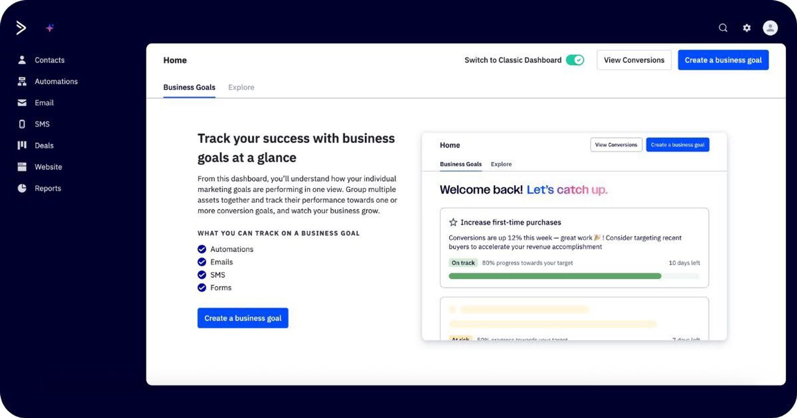 Pair this with Business Goals to track how all your marketing activities contribute to specific goals. Business Goals pulls together campaign, automation, SMS, and form data to track their collective impact on a specific goal like trial starts or purchases.