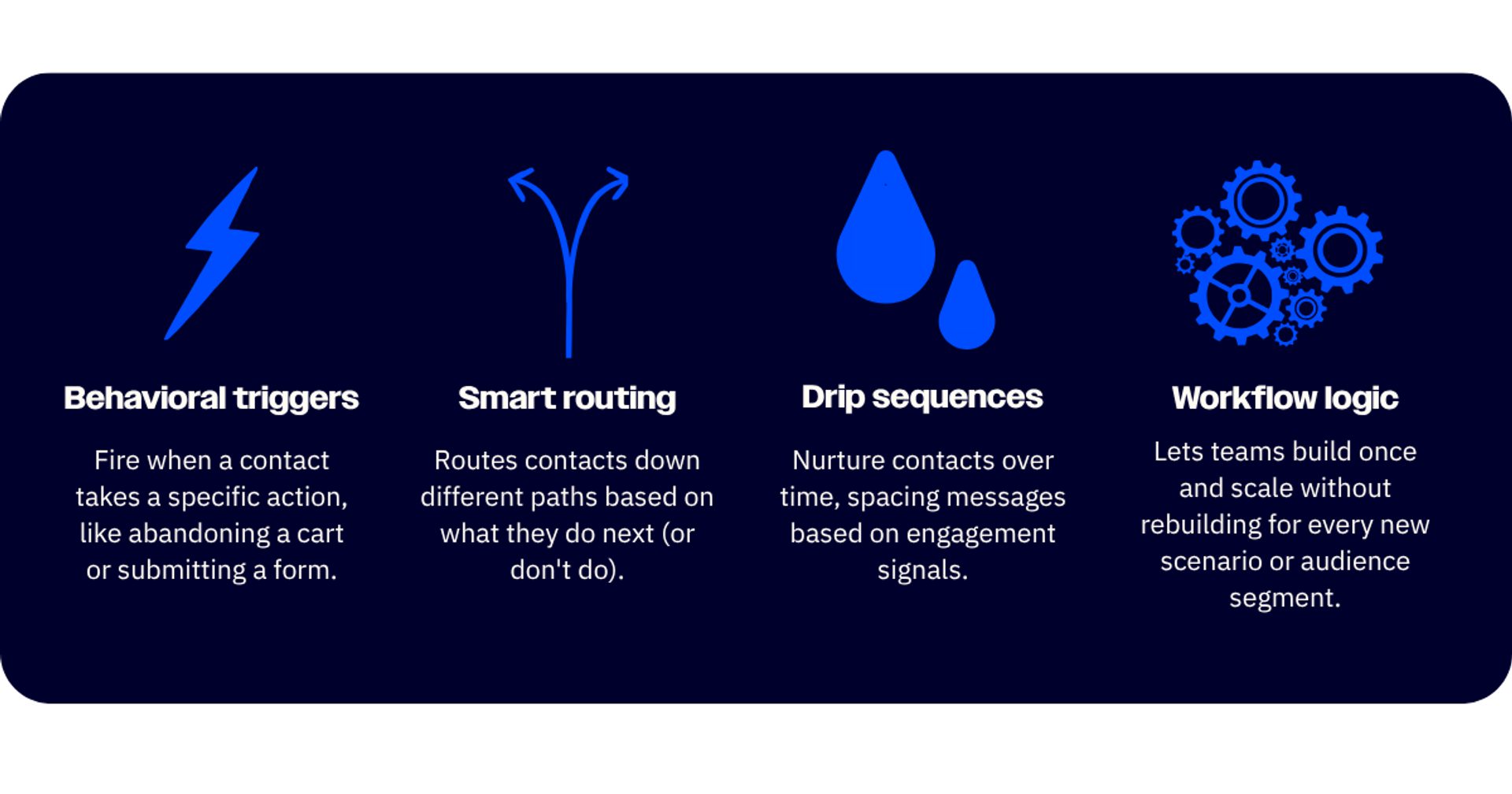 - Behavioral triggers spanning purchases, cart abandonment, page visits, form submissions, and CRM deal stage changes.