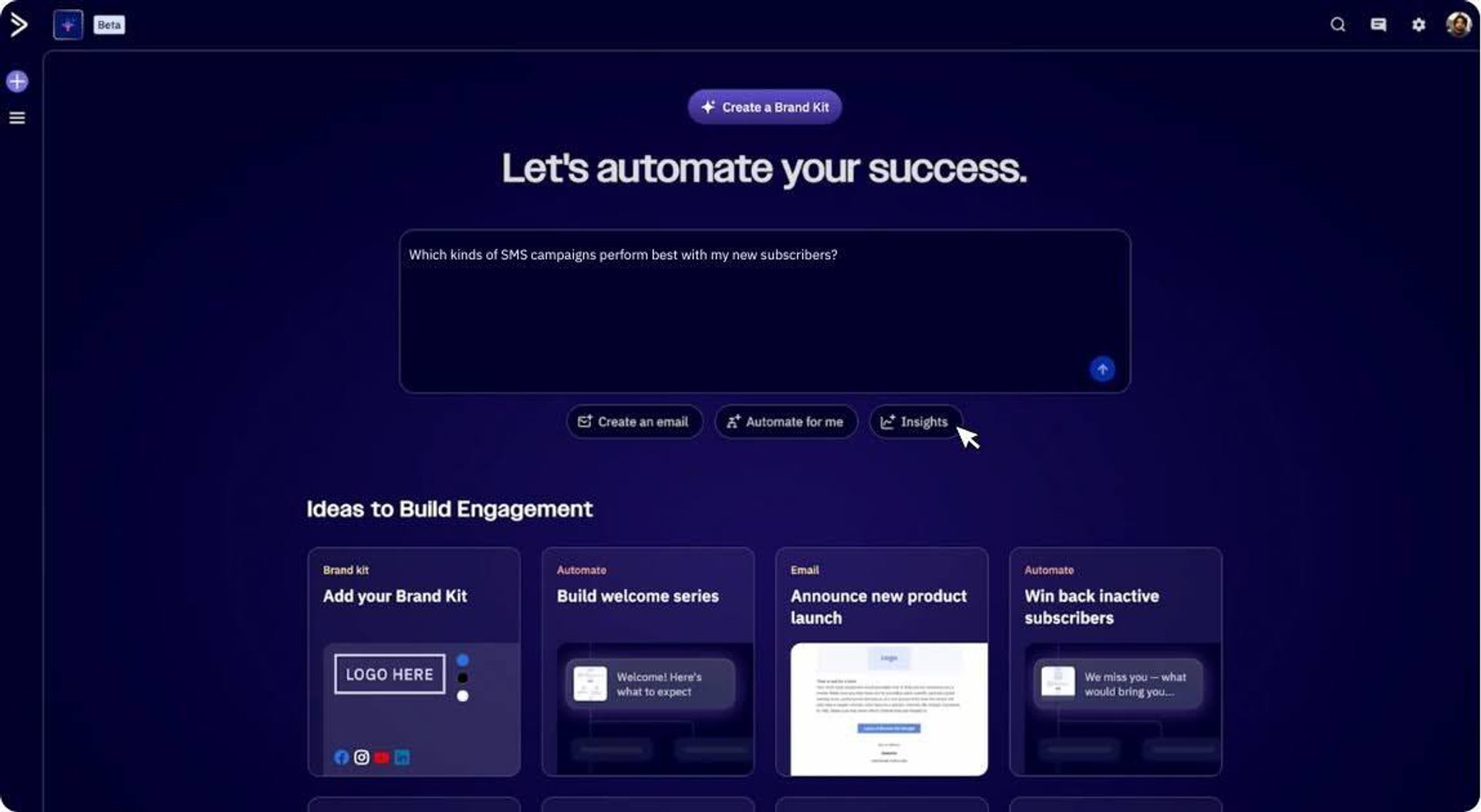 It’s important to continuously use insights to improve. Measuring and iterating transforms SMS from guesswork into a strategic channel. ActiveCampaign’s Active Intelligence surfaces actionable trends automatically, helping you understand which messages, timing, or content types perform best. It even provides recommendations for specific optimizations and improvements, or can answer plain-language questions that you have about your campaigns. By applying these insights, you can refine targeting, message content, send schedules, and CTAs to make each SMS better.