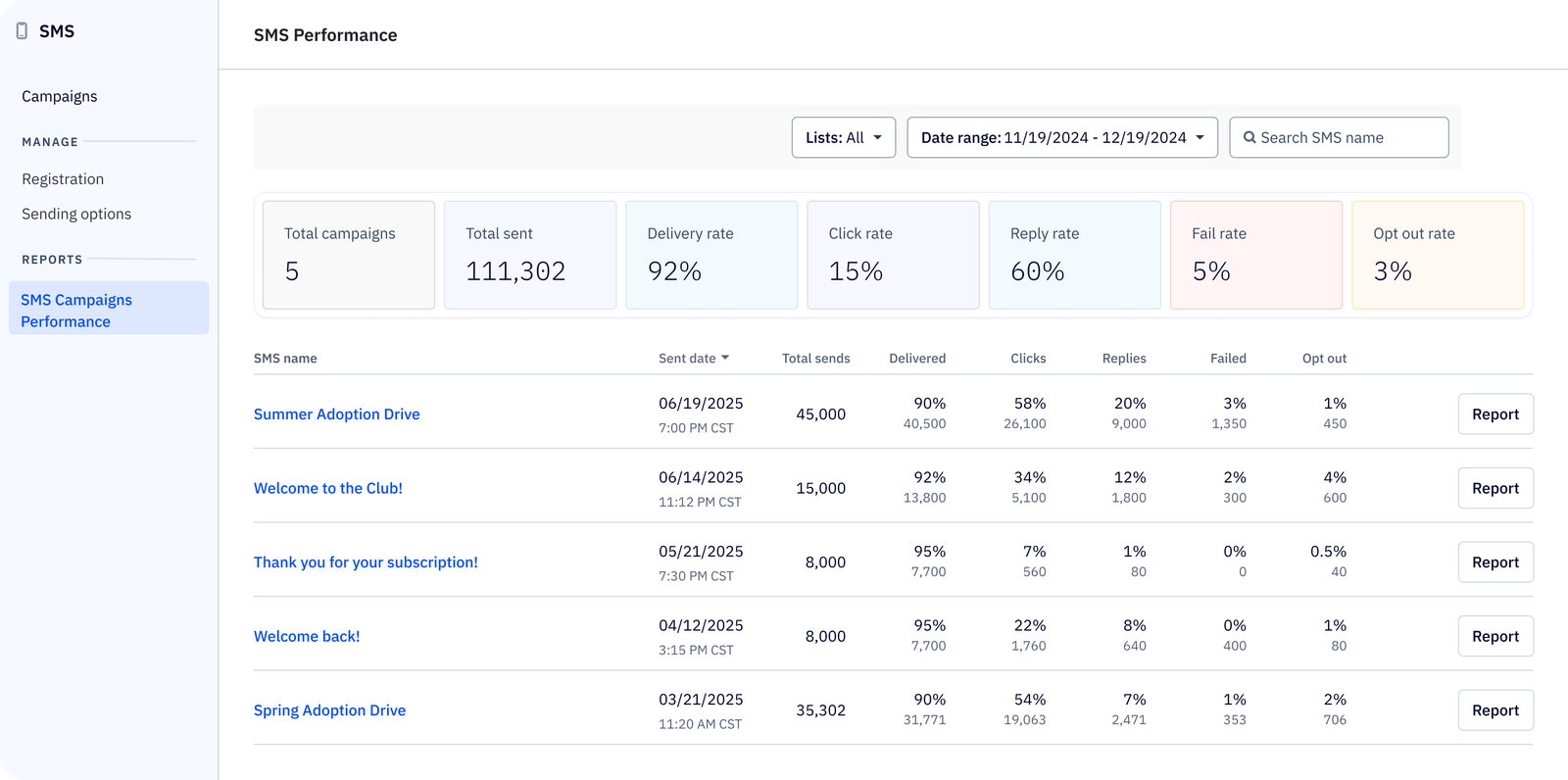- Locate the specific SMS Campaign send for which you want to view the report