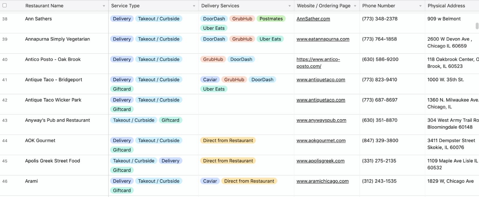 In Chicago (and 14 other cities), Dining at a Distance uses Airtable to show which restaurants “are open for take-out, curbside pick-up, or delivery during the lockdown of Chicago’s restaurants and bars during COVID-19.” The initial Chicago list was curated by Jennifer G. and Sean L., and includes a form for community members to submit additional restaurants to the list.