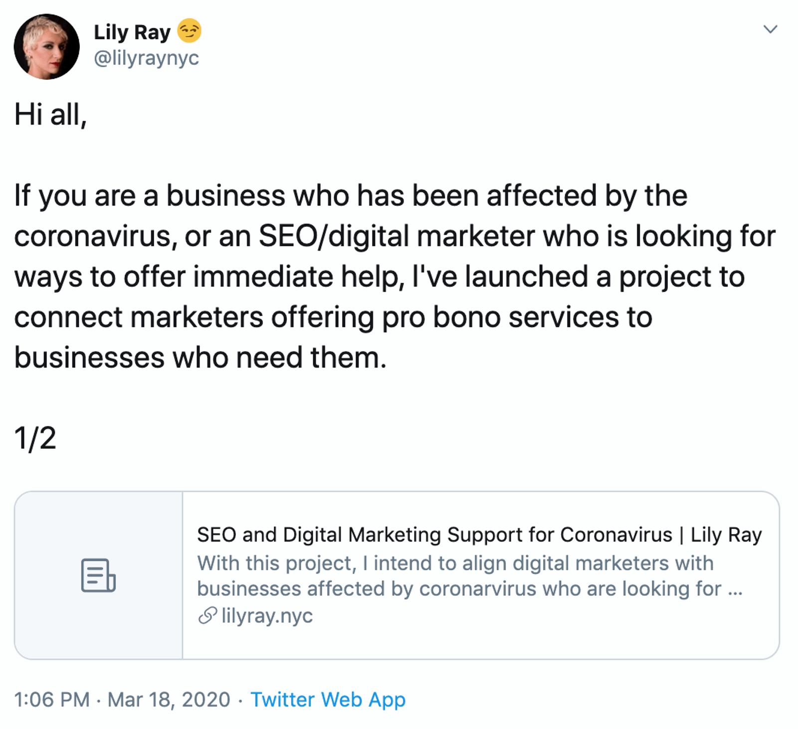 On the flip side of that initiative, SEO professional Lily Ray launched a project to match digital marketers with business owners in need of “immediate and free support in the form of consulting, strategy, or execution of digital marketing services.”