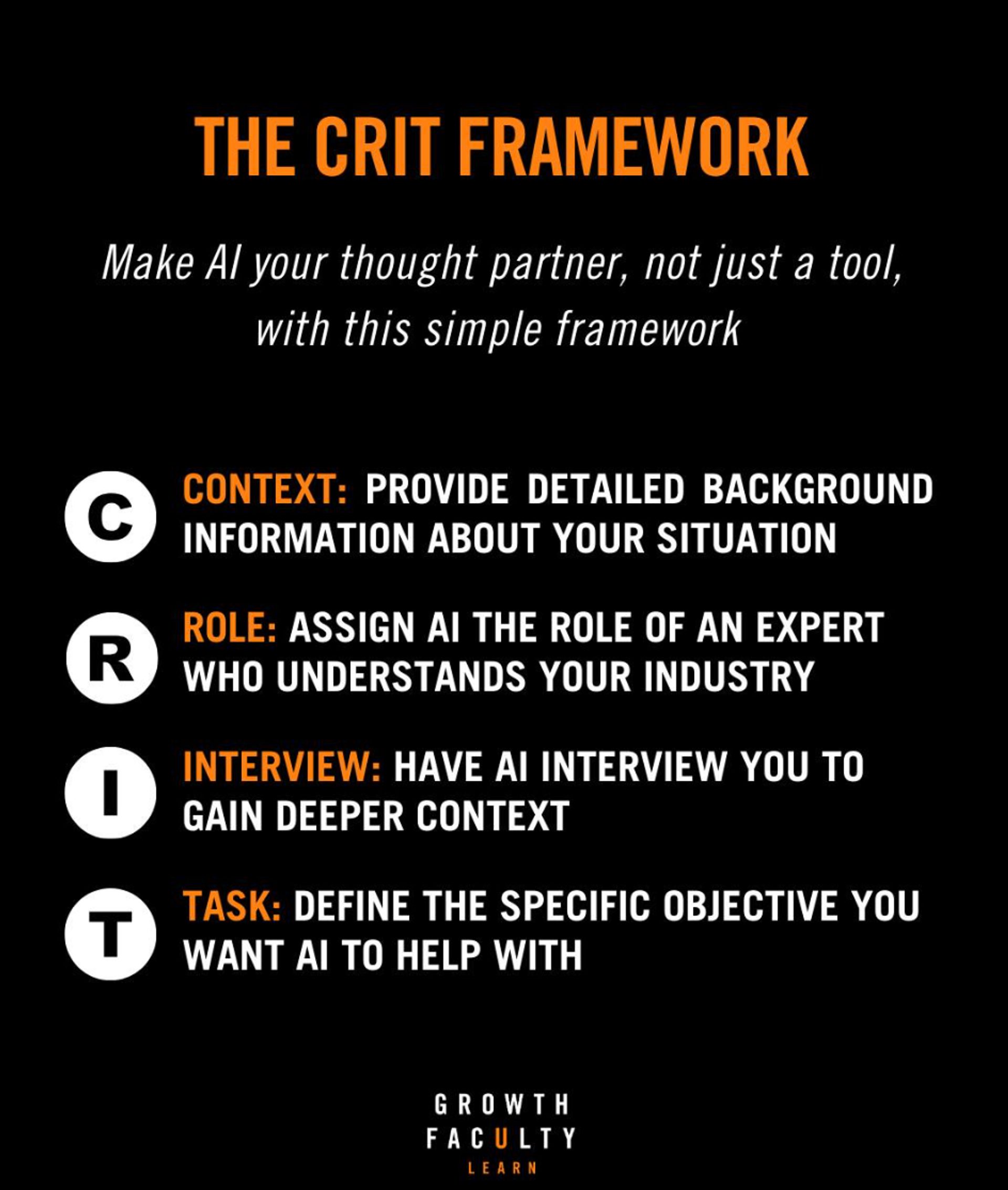 Pulizzi uses what he calls the CRIT Framework: Context, Role, Interview, Task. Instead of barking orders at AI ("Write me 10 ideas"), you…