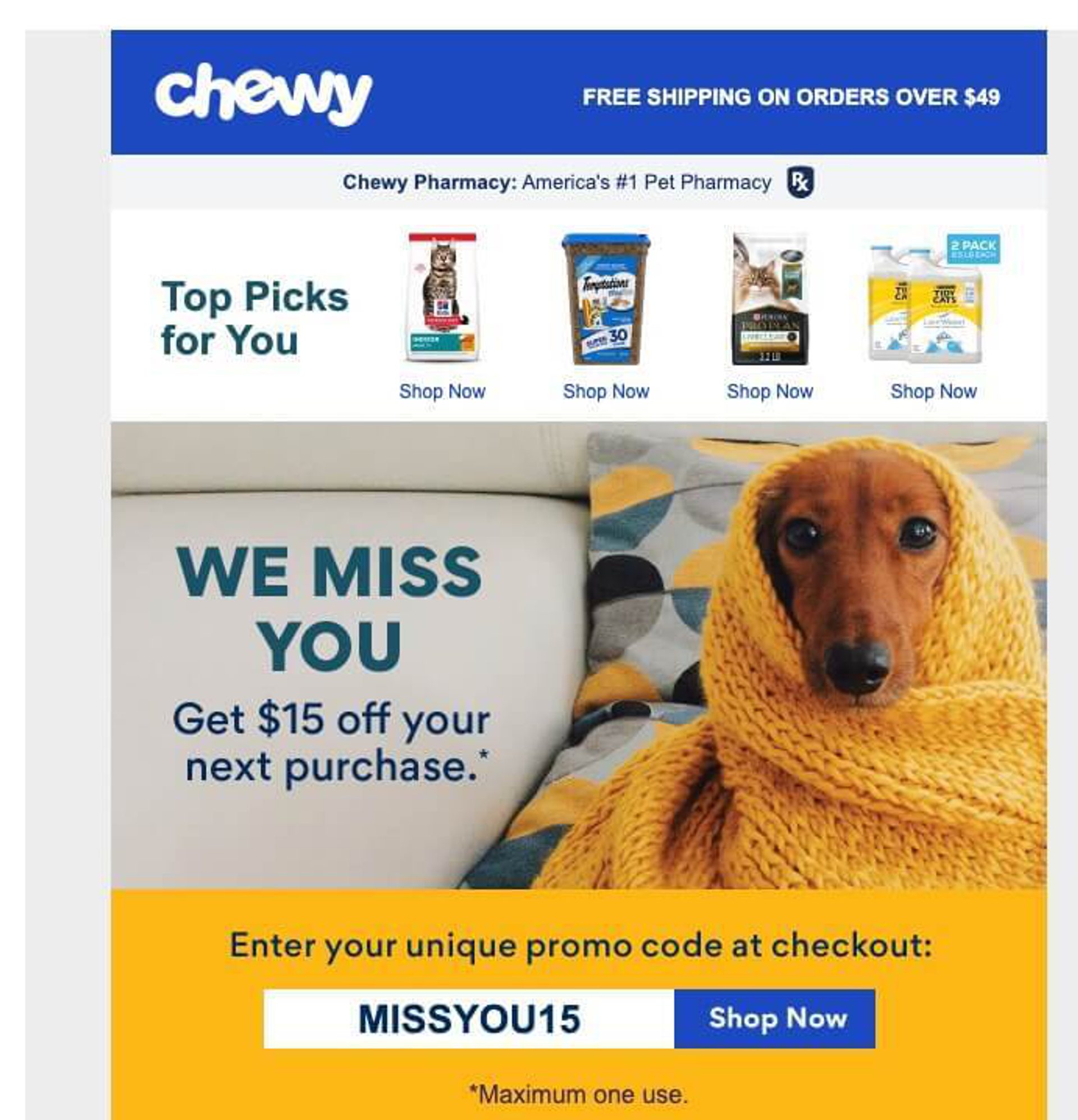 However, it's worth noting a missed opportunity in this re-engagement email. The recipient, obviously a cat person based on their "top picks," received a dog-centric image. With proper segmentation and dynamic content, Chewy could have personalized the email with a cat photo, intensifying the emotional connection. This oversight highlights the critical importance of tailoring content to individual preferences and behaviors for the most effective re-engagement. It also serves as a reminder that attention to detail can make a significant difference, even in the most compelling campaigns.