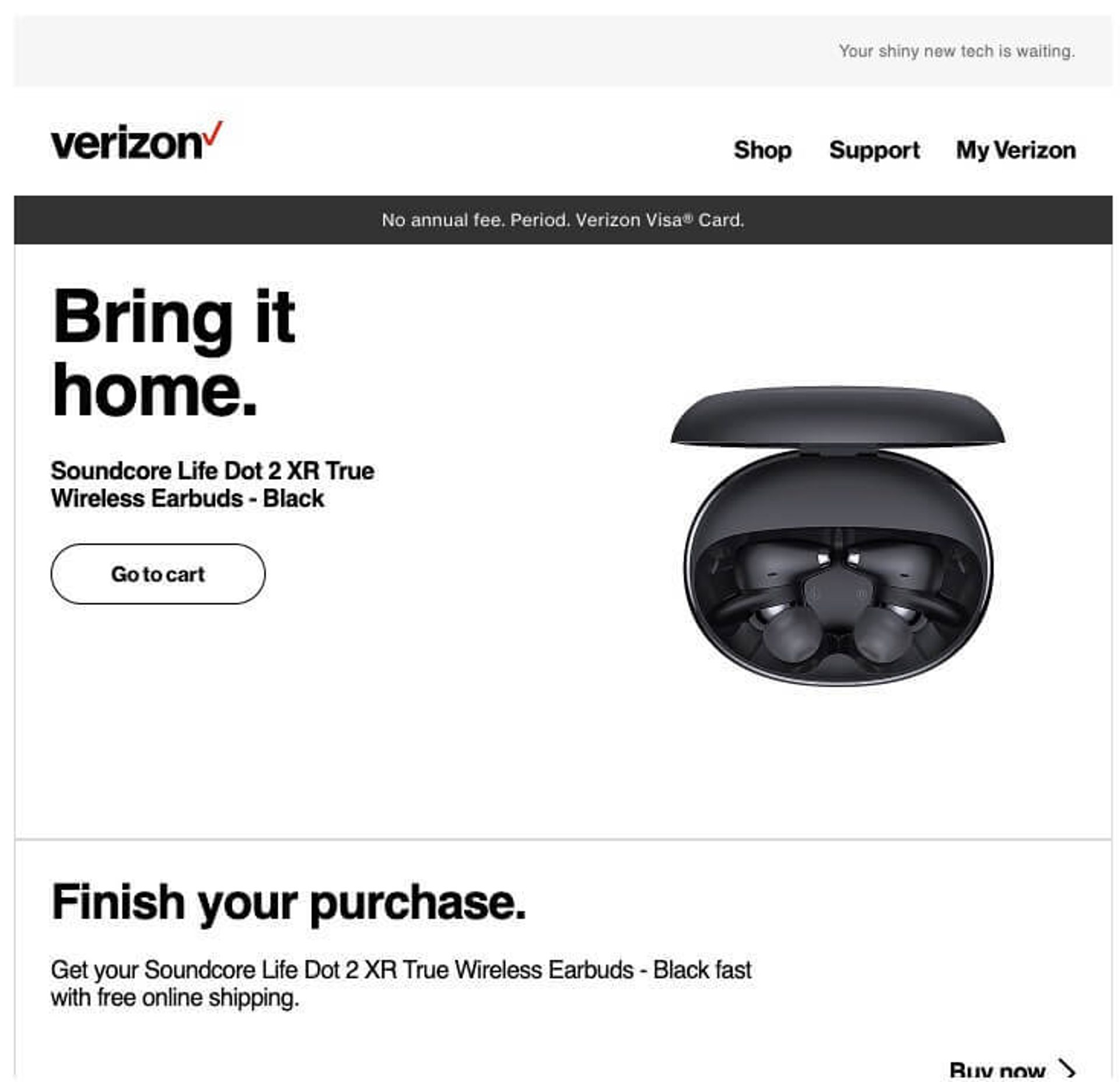 The language is not the only thoughtful aspect of Verizon's approach. They skillfully combine product showcasing with an offer of free shipping to create an attractive proposition. The layout of the email also contributes to its effectiveness; it uses white space to guide the reader's eye toward the product image and the "go to cart" button. By focusing on the product, Verizon reinforces the desire to complete the purchase.