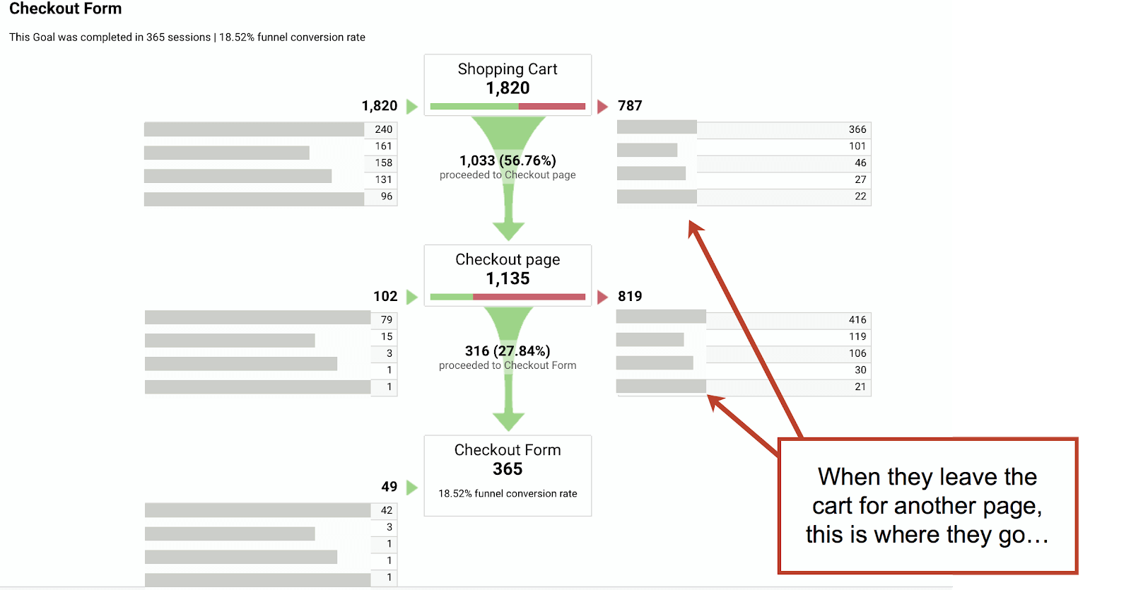 A funnel visualization report shows you what percentage of people made it through each step. If they didn’t proceed to the next step in the funnel, this report shows you what page on your site they went to instead.