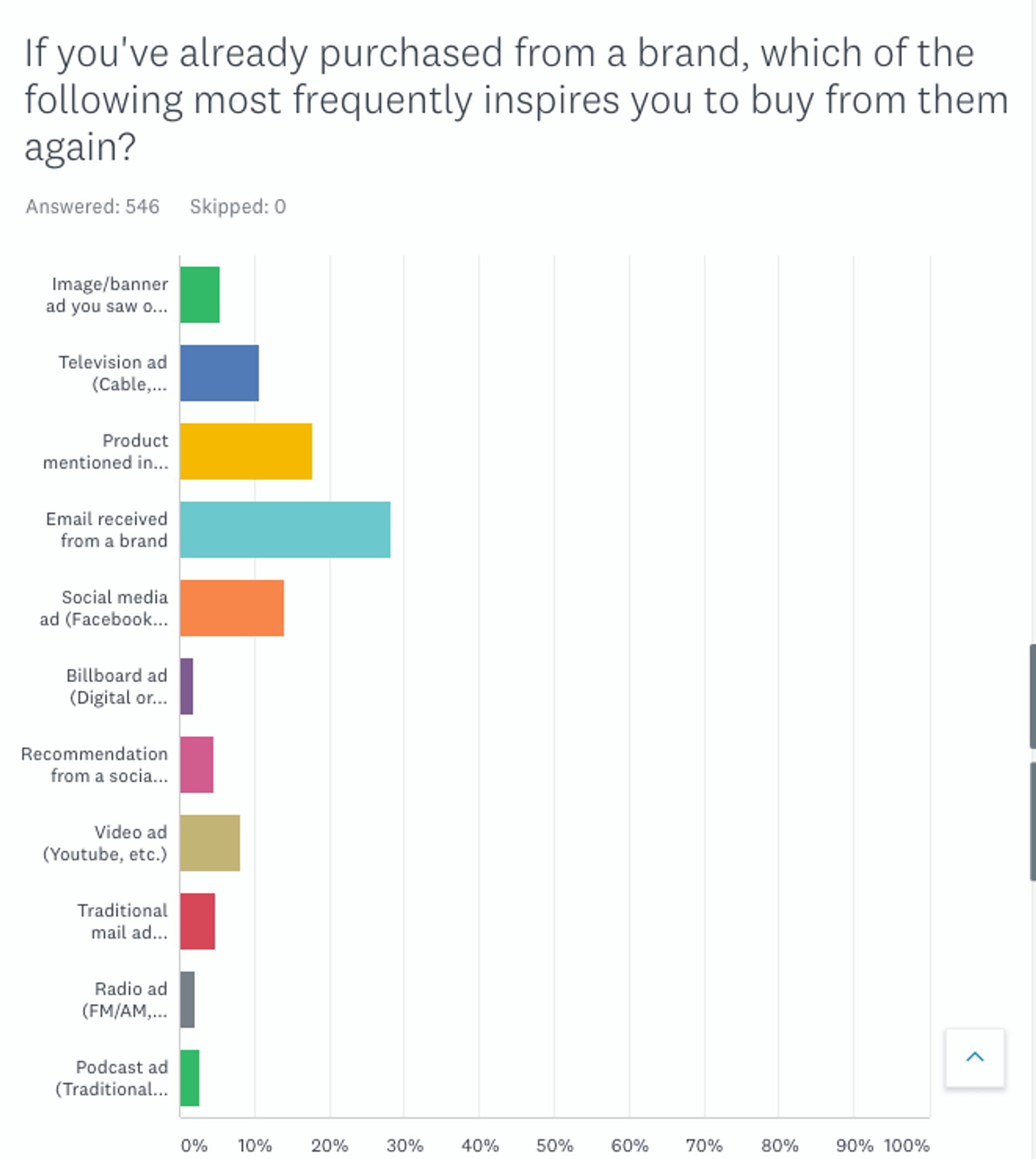 Creating repeat buyers is where email marketing shines. Emails allow brands to target and engage customers on a personal level. (Learn more about this ecommerce research here.)