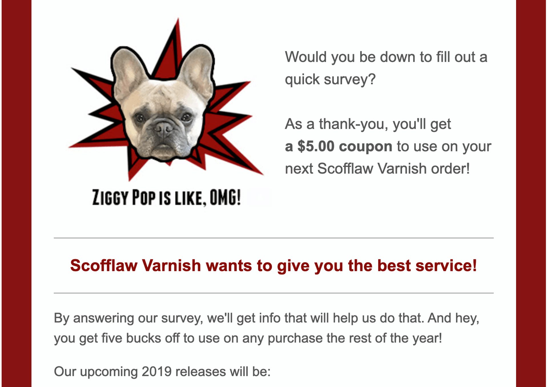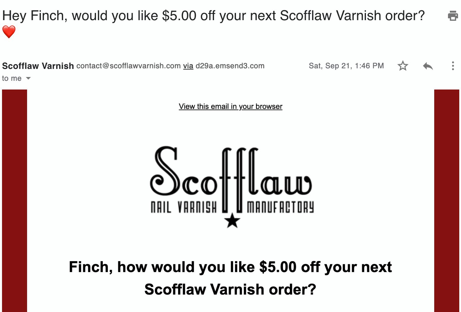 Email marketing is Scofflaw Nail Varnish’s number one driver of repeat purchases.