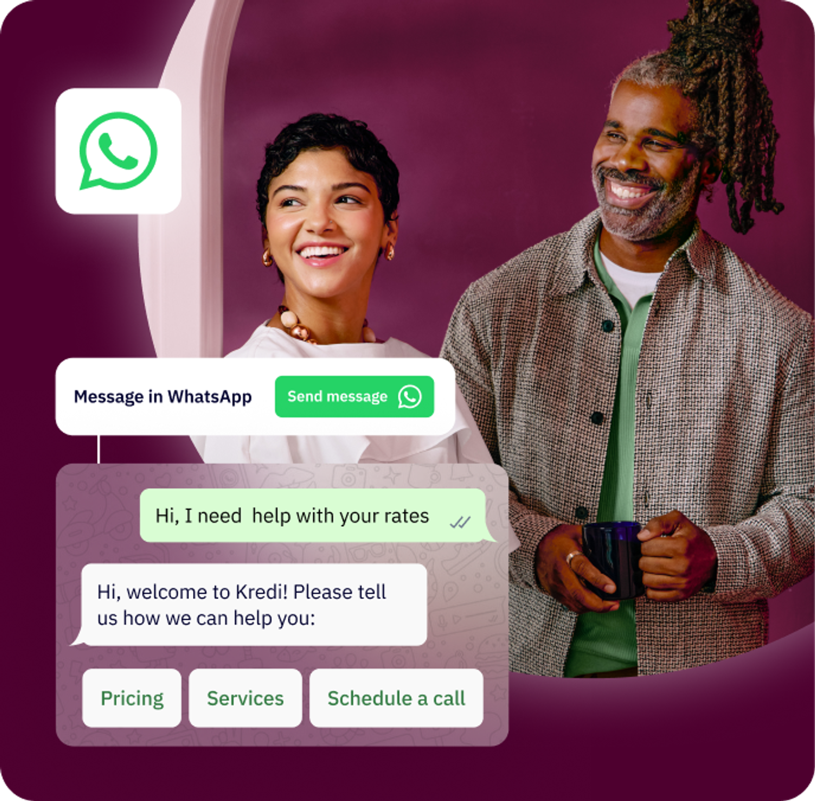Customers in the market for tailored mortgage credits and quotes can turn to Kredi directly on WhatsApp to get the information they need. WhatsApp Messaging’s shared inbox makes it easy for Kredi to streamline their customer communications and keep every team informed. Kredi also created a chatbot, Andrea, to help save time by profiling customers and assigning messages to the appropriate team member with Flows. With Andrea, customers can find tailored mortgage credits and quotes almost instantly, without ever having to leave WhatsApp.