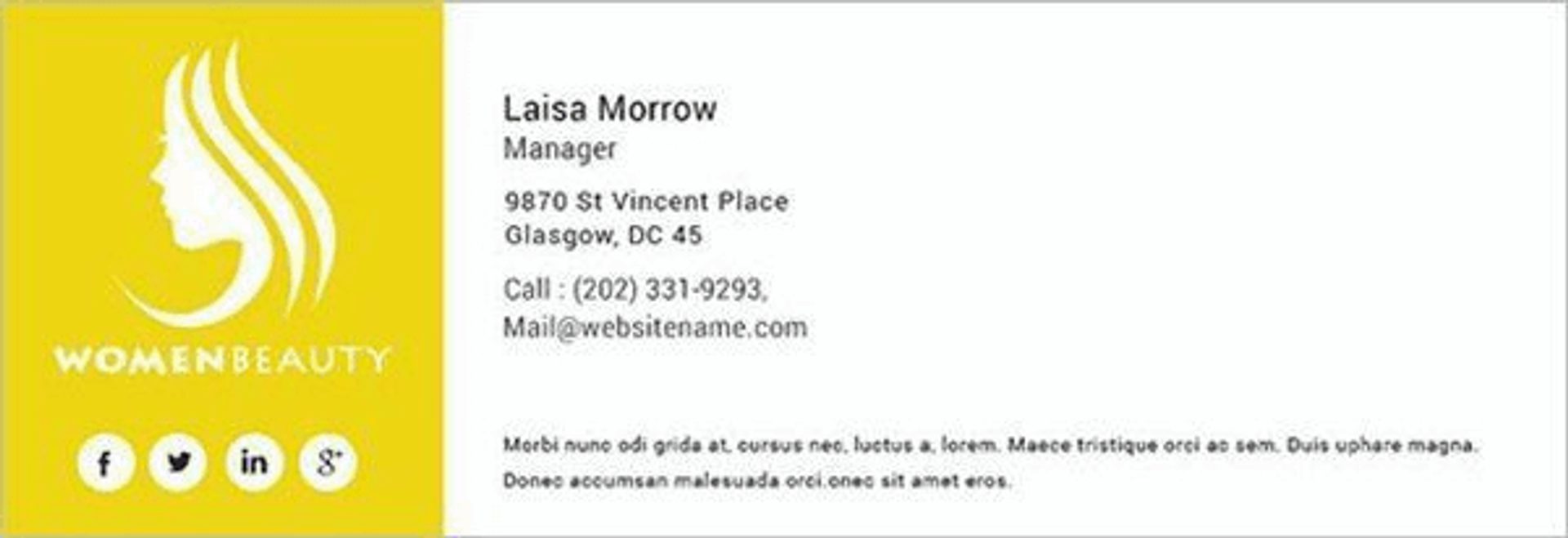 Neste exemplo, foi utilizado um logotipo. As informações também são semelhantes. No entanto, aqui também consta um endereço físico e um espaço para uma frase no final.