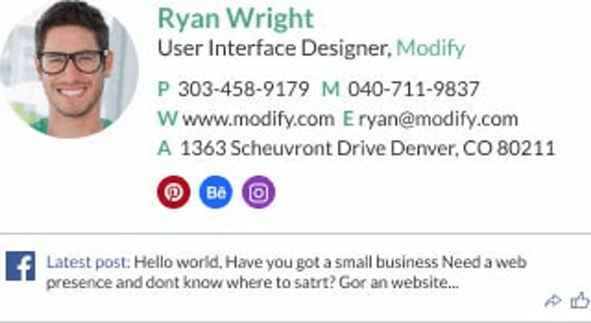 Em vez de utilizar apenas um ícone no facebook, essa assinatura traz um resumo do último post de texto. Essa pode ser uma opção interessante se você procura mais engajamento nas redes sociais.
