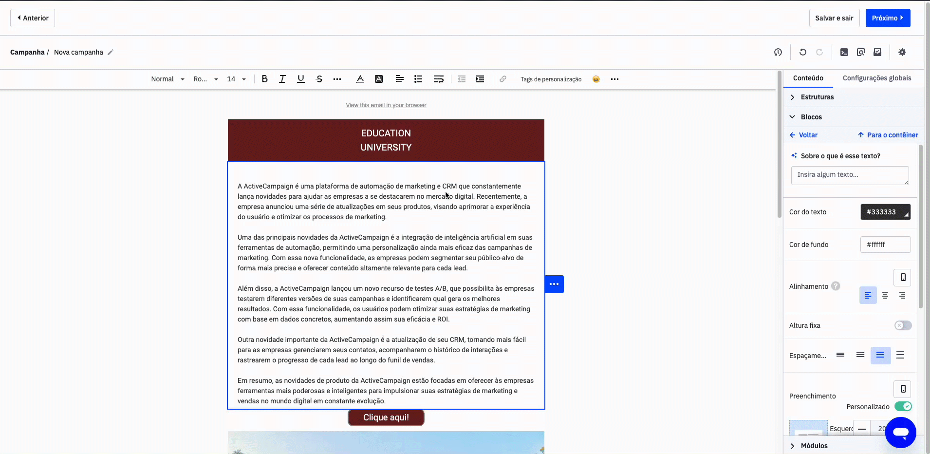 Agora ficou mais fácil adicionar links em textos, botões e imagens no editor de campanhas da ActiveCampaign. Um pop-up aparecerá ao clicar para adicionar um link, facilitando assim o uso de links mais longos e, também, a edição de links.