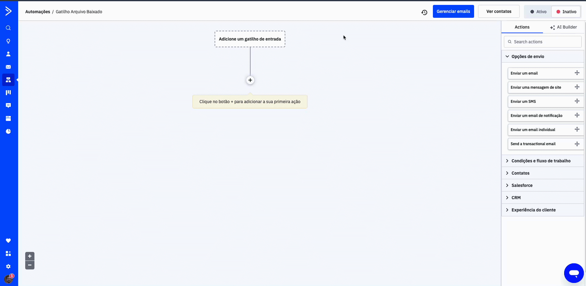 Agora é possível adicionar um gatilho nas automações para quando um arquivo for baixado por um contato. Essa é uma função que está disponível em adição a possibilidade de anexar arquivos nos emails individuais. É possível selecionar como gatilho qualquer arquivo baixado, ou segmentar por nome, por exemplo.
