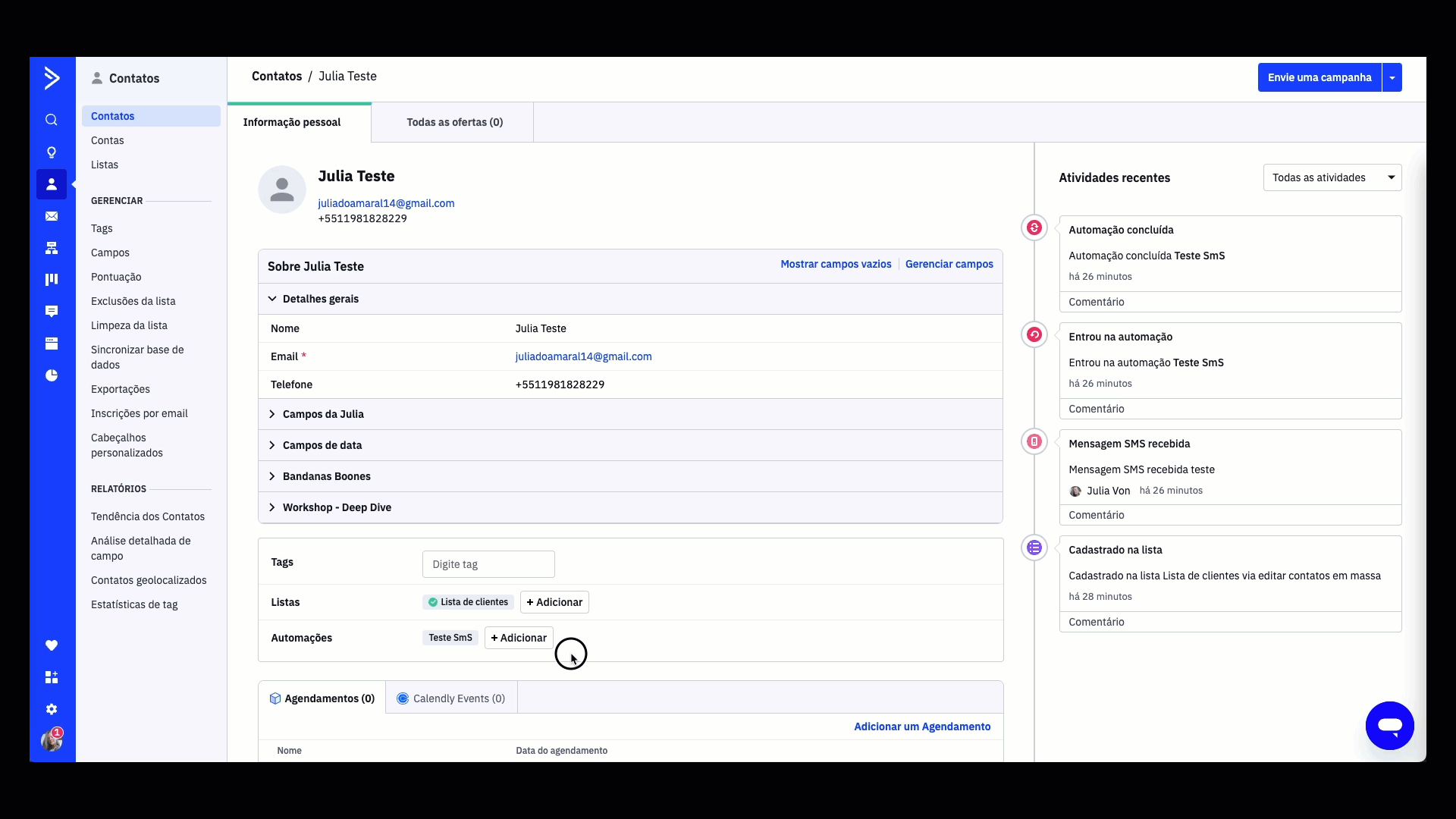 - SMS: Aba de SMS no registro de contato e fluxo de atividades).