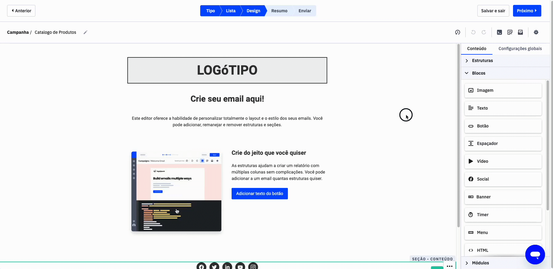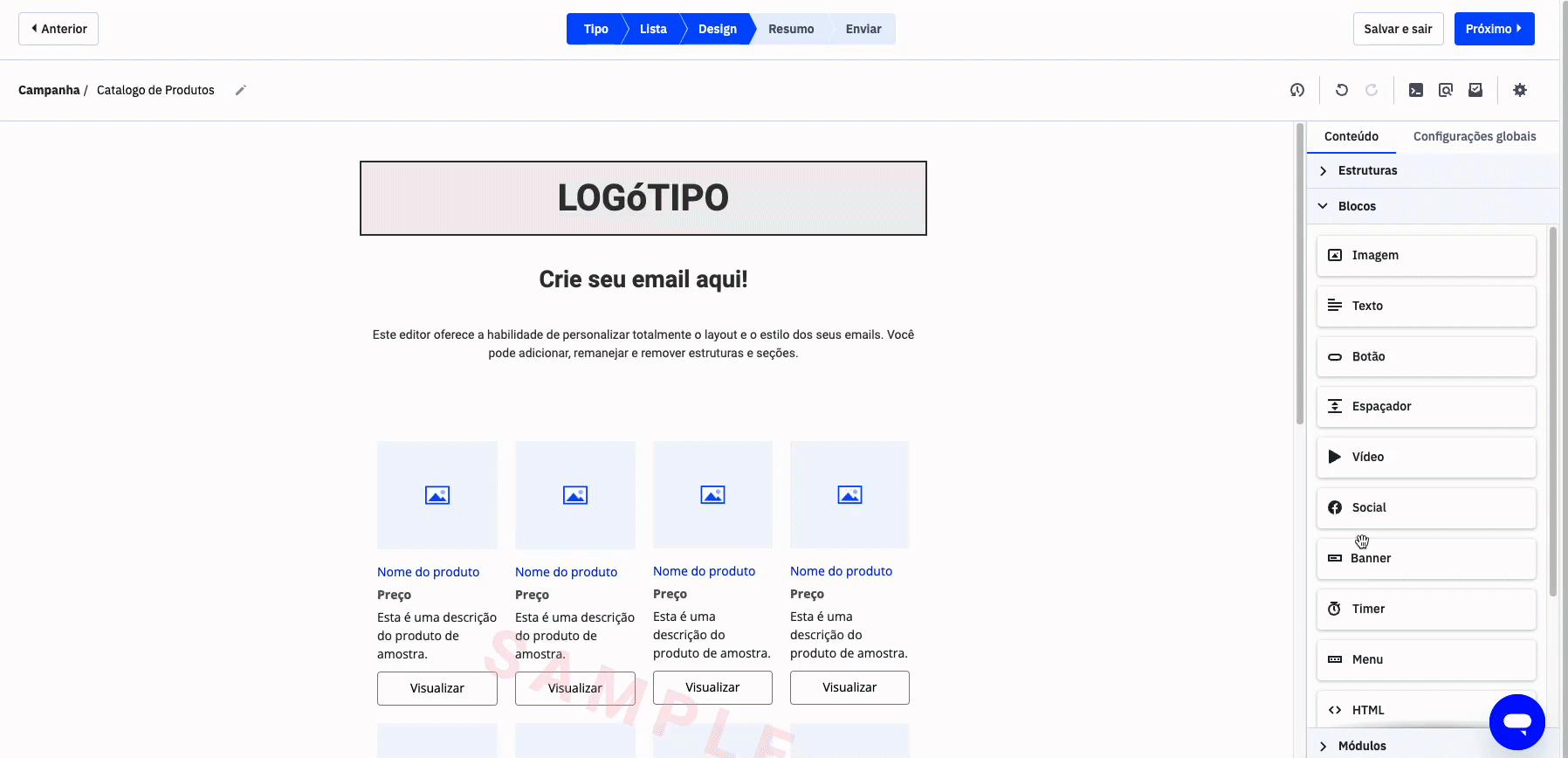 Para saber mais sobre a funcionalidade e como utilizar, acesse nosso artigo da central de ajuda Editor de emails: use o bloco Catálogo de Produtos em suas campanhas de email!
