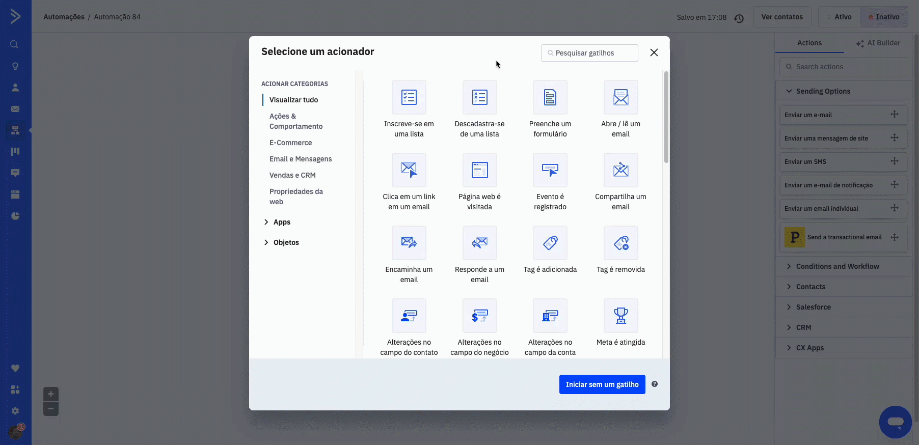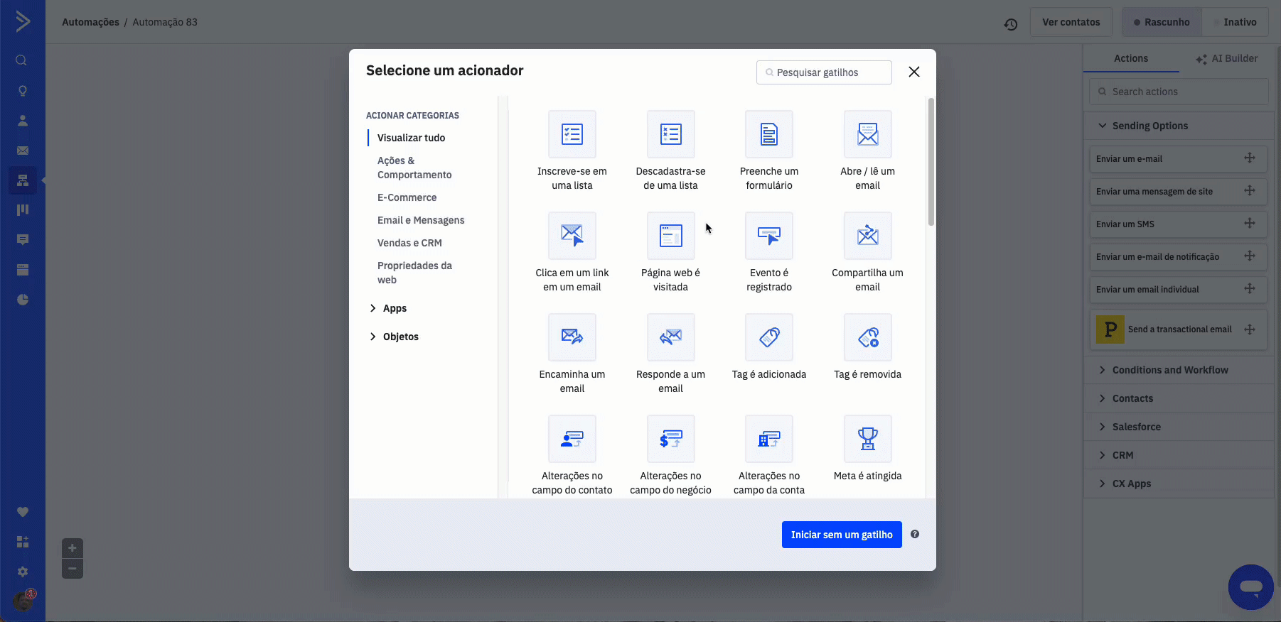 Um criador de segmentação aprimorado em todos os gatilhos da ActiveCampaign. Isso significa que todas as novas condições, como janelas de atividades de email, seleção de múltiplas tags, status da lista de contatos e muito mais, poderão ser feitas usando gatilhos.