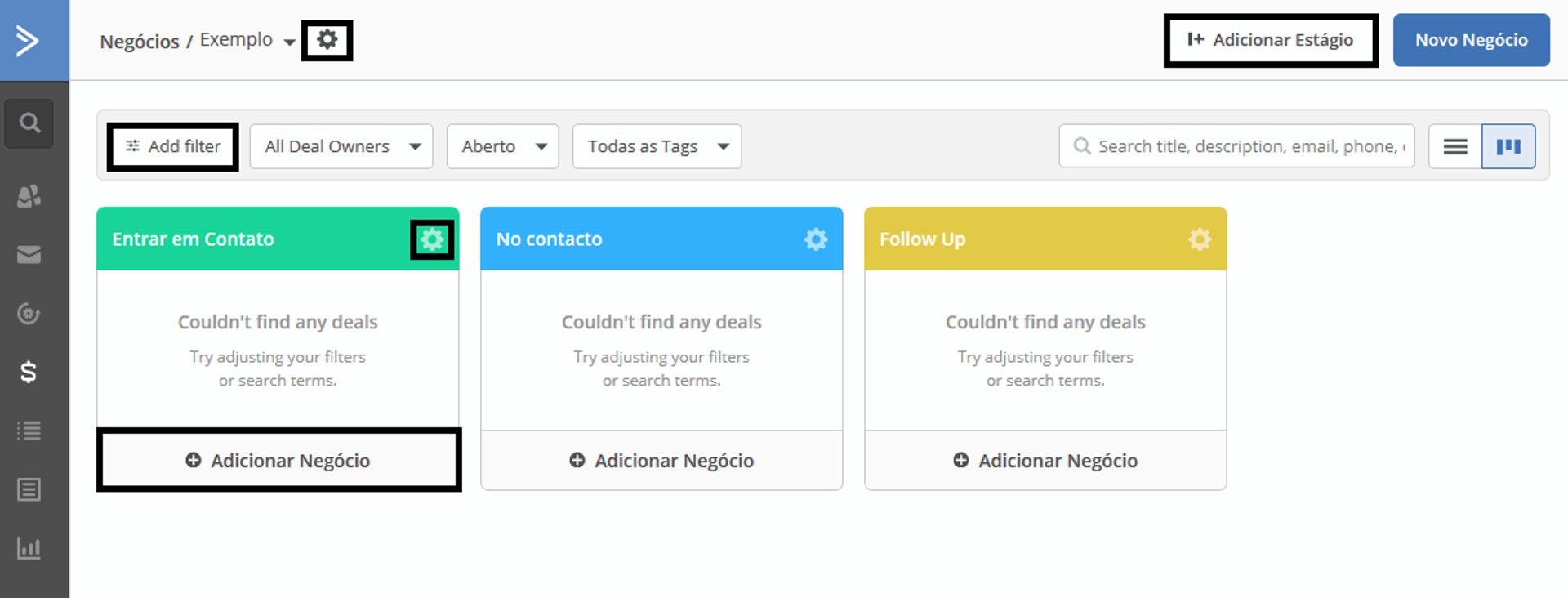 É só clicar e arrastar para mover os negócios entre diferentes estágios ou para organizar a plataforma. Veja, em destaque, algumas das opções de personalização: