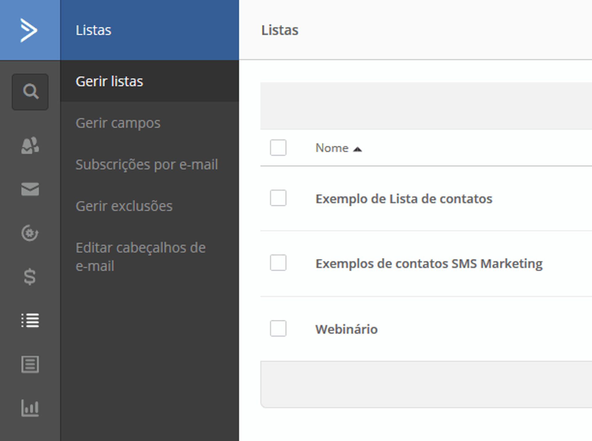 No menu do lado esquerdo da plataforma, você encontra as opções “contatos” e “listas”. Esses dois recursos podem ser utilizados para gerenciar seus leads, tanto manualmente quanto programando interações automáticas.