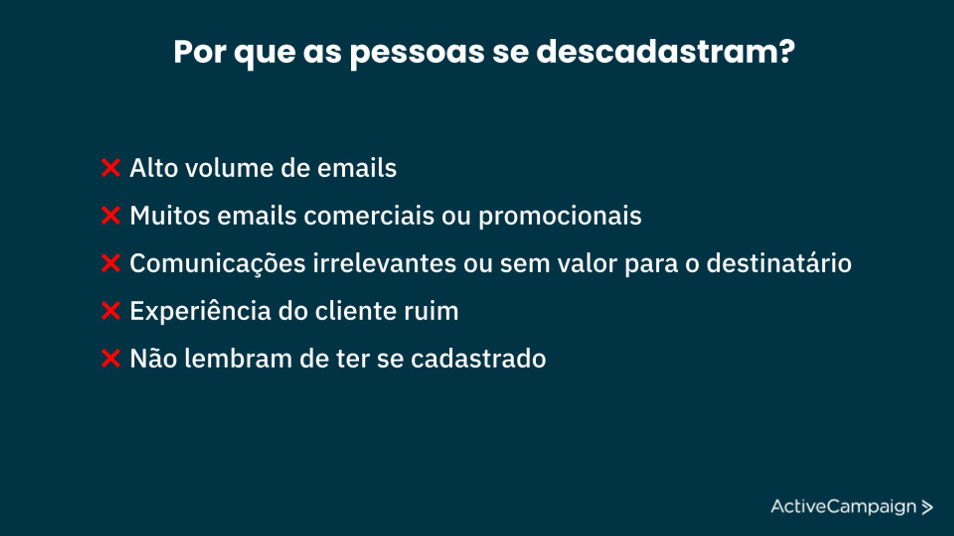 Há muitos motivos pelos quais os destinatários optam pelo descadastro dos seus emails. Entender esses motivos pode ajudar você a ajustar sua estratégia e melhorar a retenção de inscritos. Alguns motivos comuns incluem:
