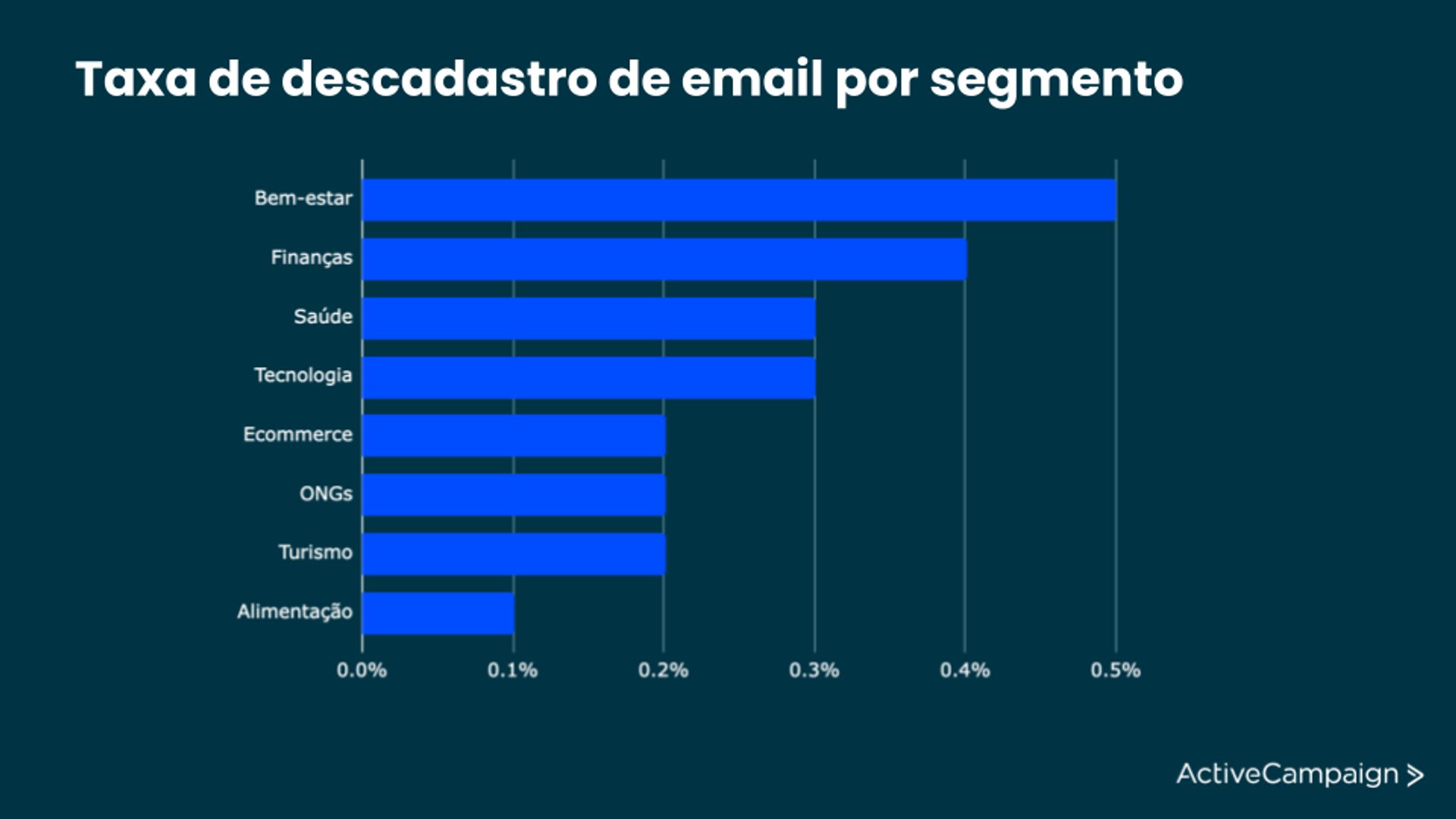 - Serviços financeiros: as taxas de cancelamento de inscrição no setor de serviços financeiros ficam entre 0,2% e 0,4%. Como informações financeiras possem ser confidenciais e urgentes, oferecer conteúdo relevante, preciso e na hora certa é vital para manter o engajamento.