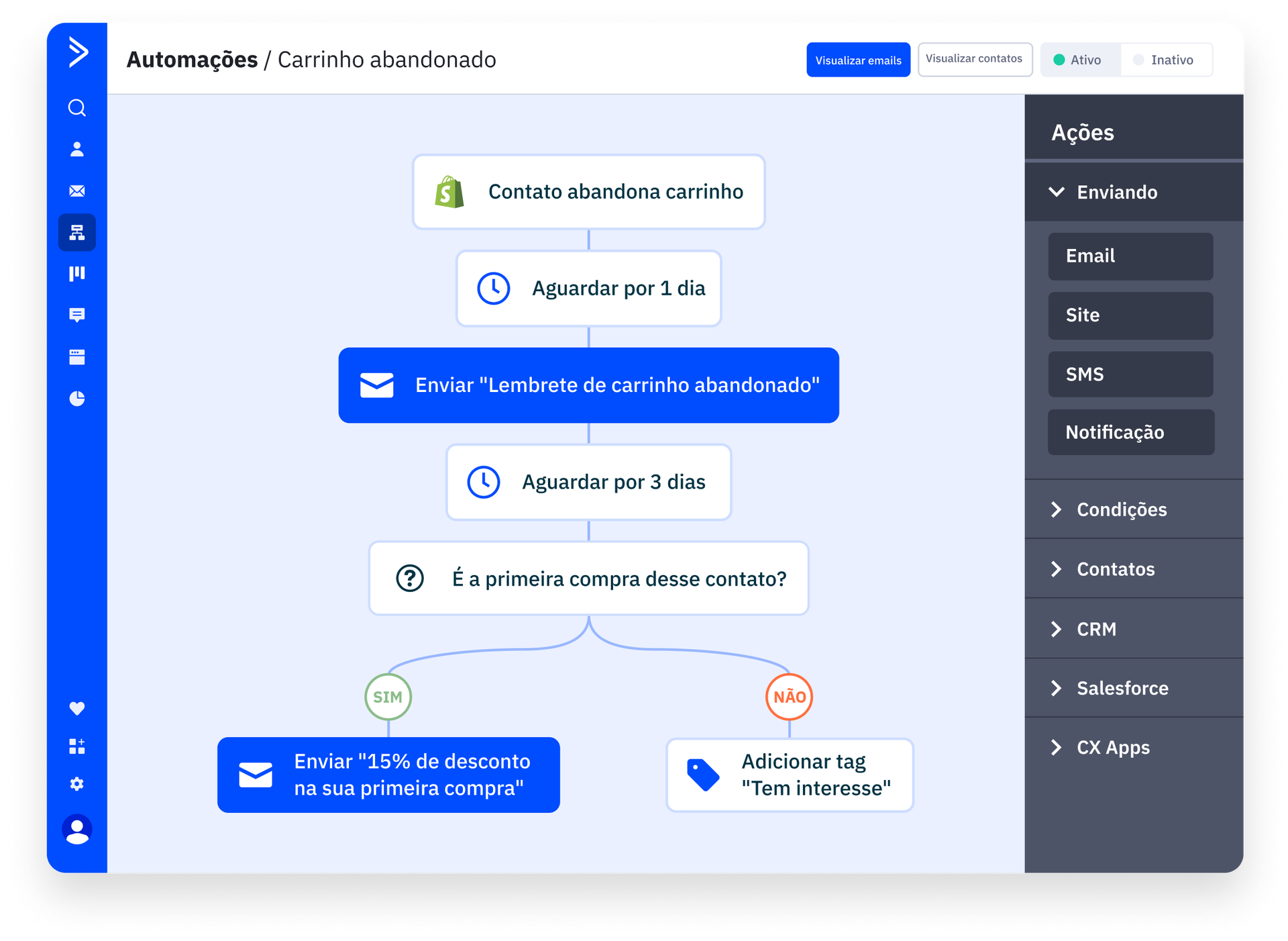 Outra maneira de melhorar o suporte ao cliente é usar um software de automação de marketing para otimizar a comunicação, personalizar as interações e responder rapidamente. Plataformas de automação como a ActiveCampain ajudam a automatizar sistemas de marketing, enviar mensagens direcionadas e oferecer ofertas adaptadas às preferências individuais de clientes, criando uma experiência mais personalizada. As ferramentas de automação também permitem que as empresas engajem os clientes em várias plataformas e canais, garantindo mensagens e branding consistentes.