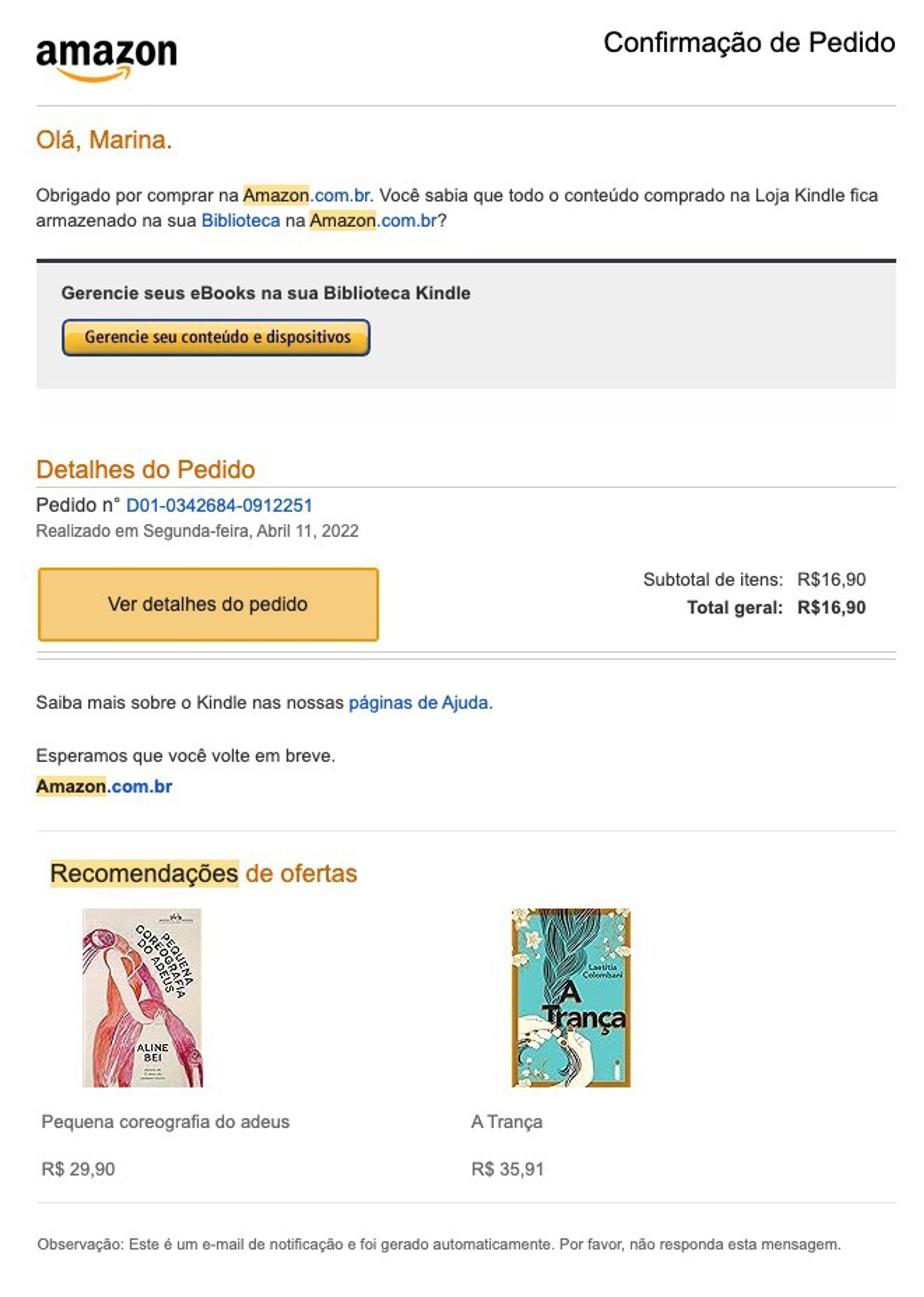 A Amazon envia emails de remarketing constantemente com base em coisas que seus clientes fazem e, acredite, isso funciona. No exemplo abaixo, inclusive, a recomendação de produtos relacionados já é feita na própria confirmação de um pedido recém-feito.