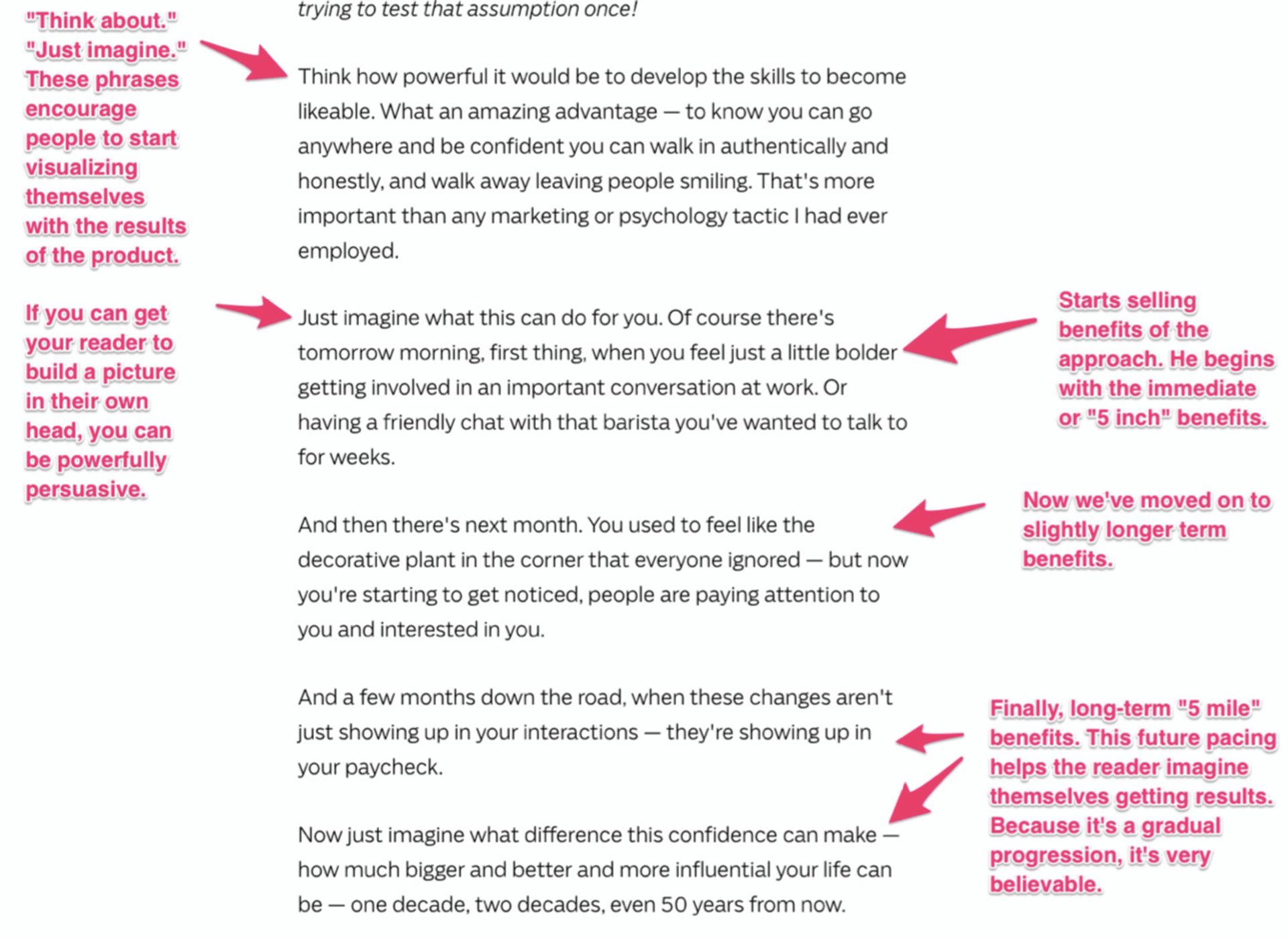 Ramit usa o future pacing para mostrar os benefícios em quatro fases:- Logo após comprar o produto