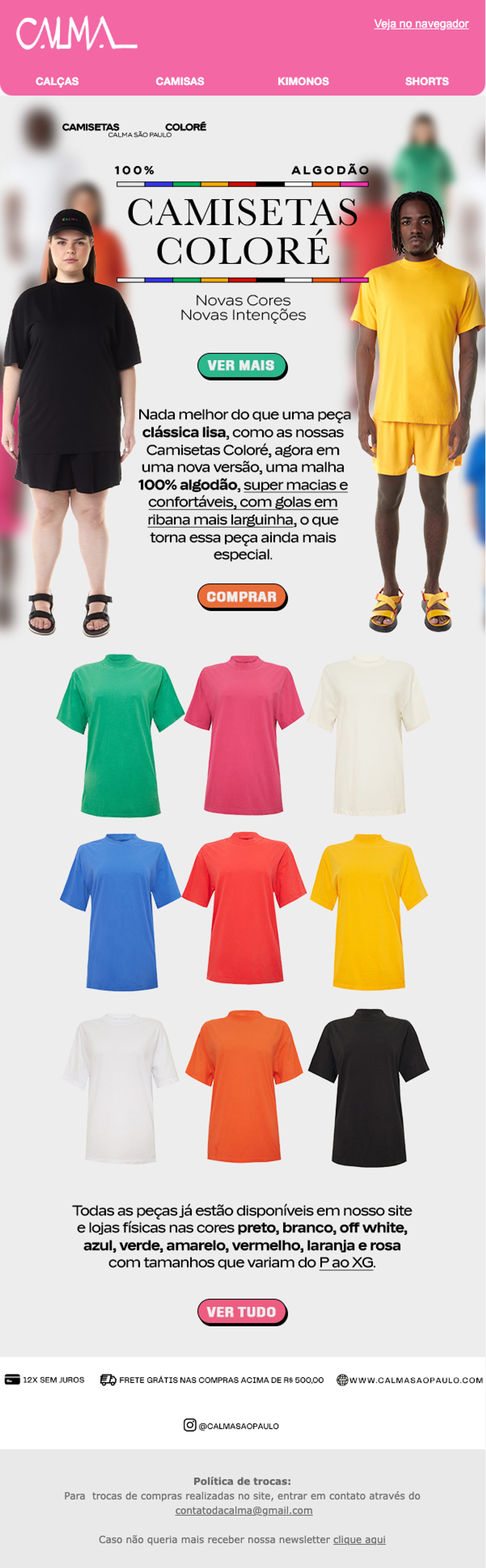 Ao lançar uma nova coleção de camisetas, a Calma São Paulo enviou um email em massa para sua base de clientes, a fim de atingir o maior público possível e informar sobre seus novos produtos. Essa foi, sem dúvida, a escolha certa para o tipo de anúncio que a empresa precisava fazer.