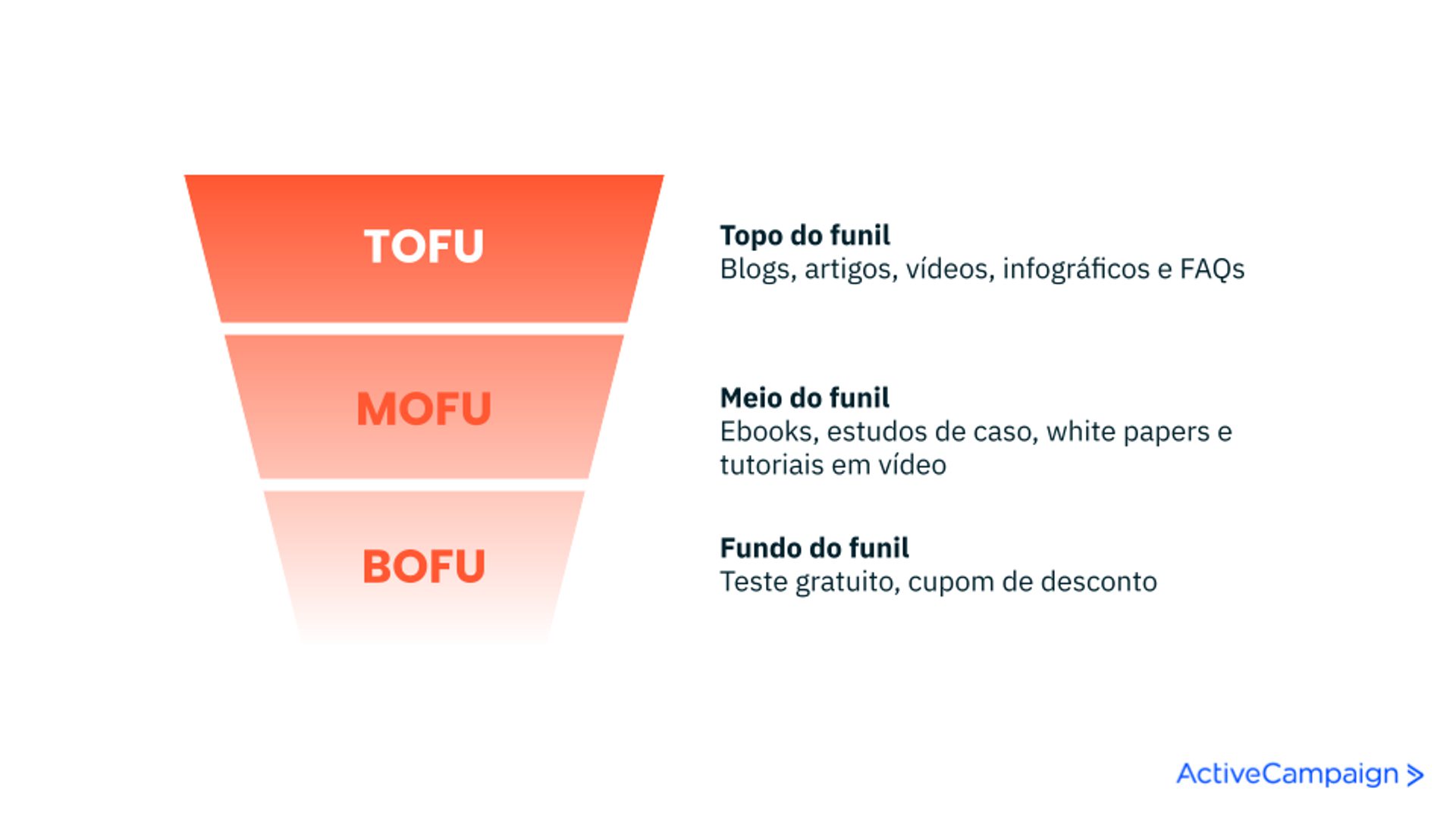 - TOFU: blogs, infográficos, conteúdo de redes sociais, imagens, vídeos e artigos