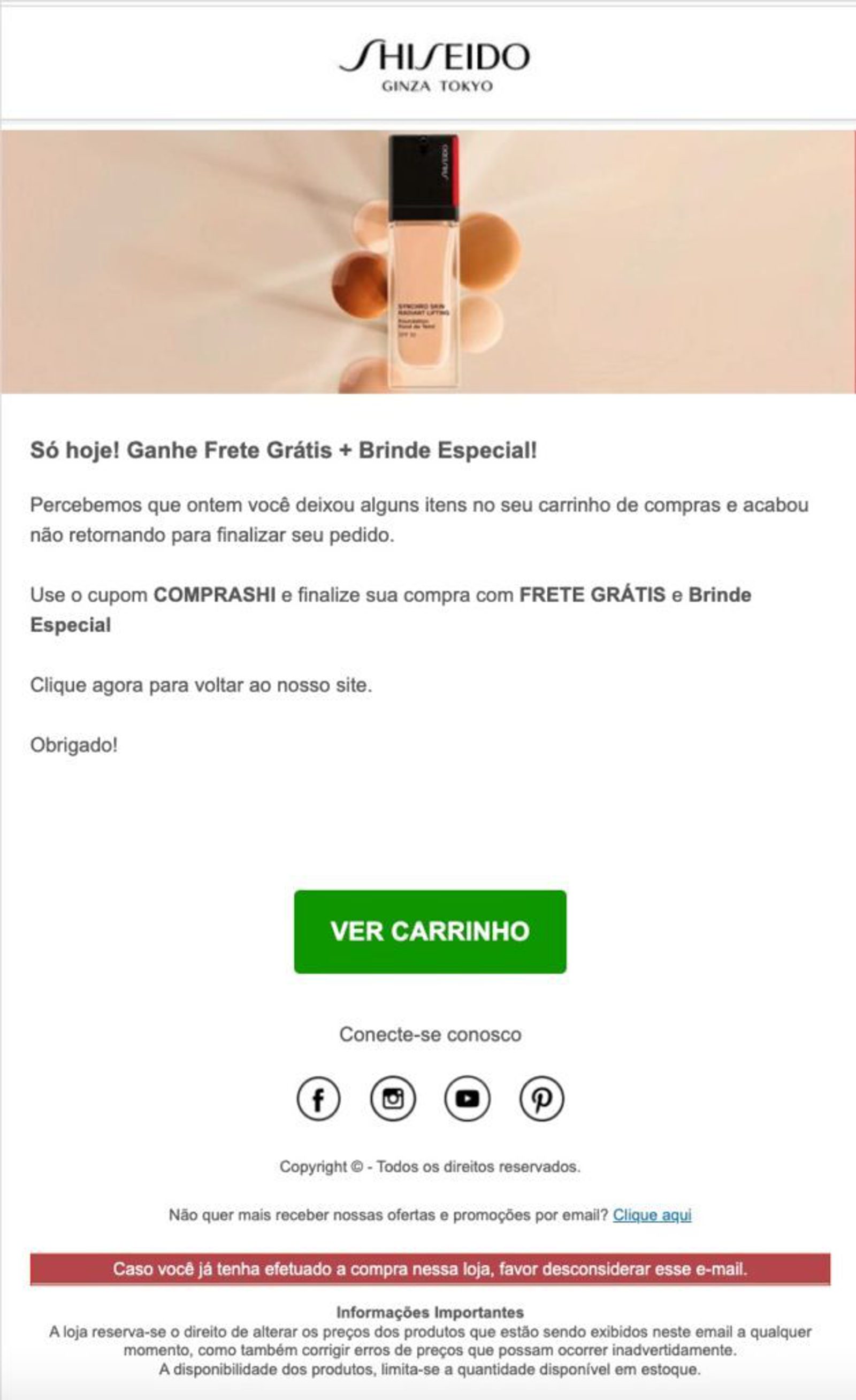 Vejamos o exemplo de email abaixo da Shiseido: