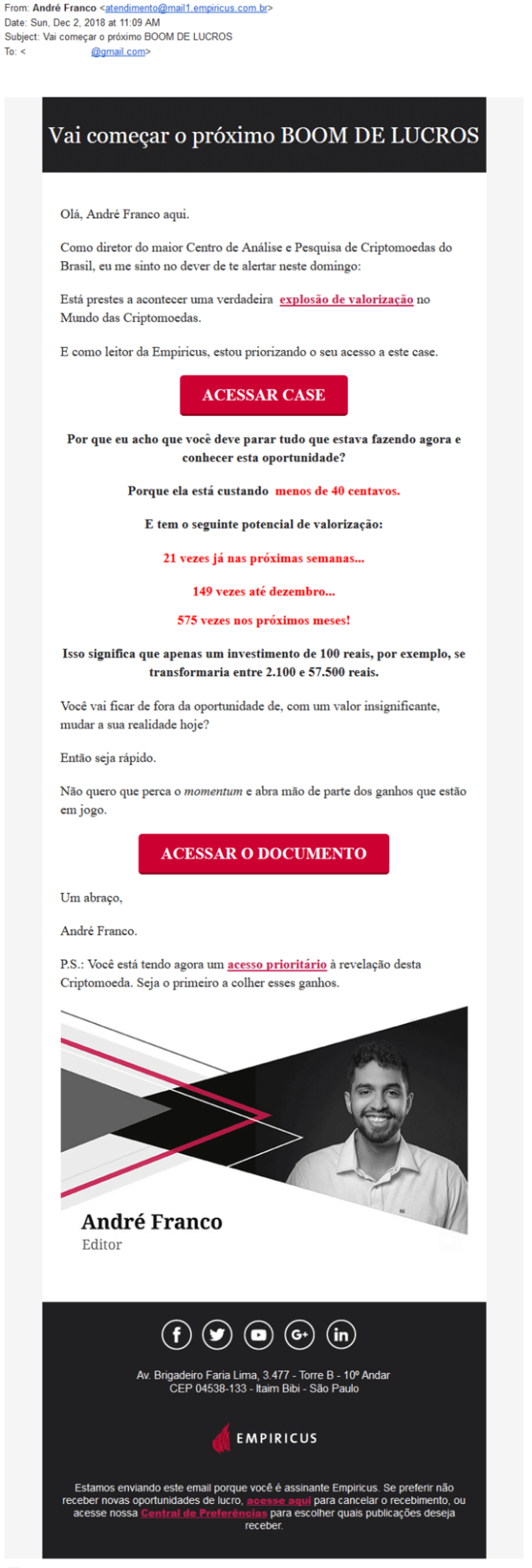 Esse email da Empiricus é de aspecto informativo. Ou seja, é um modelo de newsletter. Apesar do design moderno e cores chamativas, a estrela desse exemplo de email marketing é a forma como o texto foi escrito.