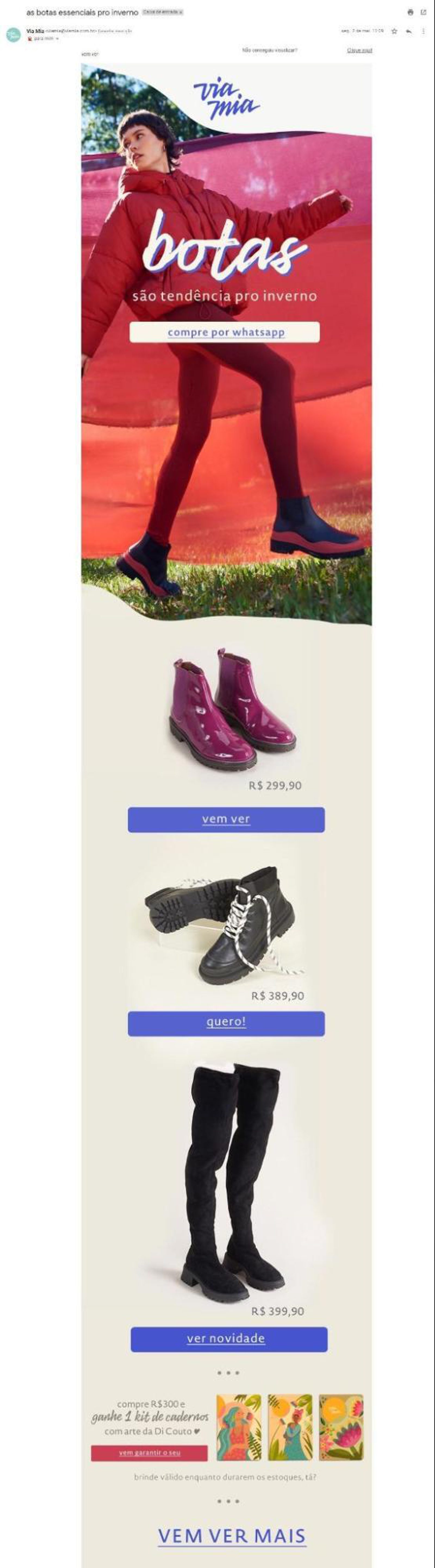 Esse exemplo de email marketing promocional é extremamente simples, mas que se trata de uma mensagem sazonal. A loja em questão está oferecendo uma bota, típica para o momento da estação em que a leitura está vivenciando, o que faz com que desperte interesse.