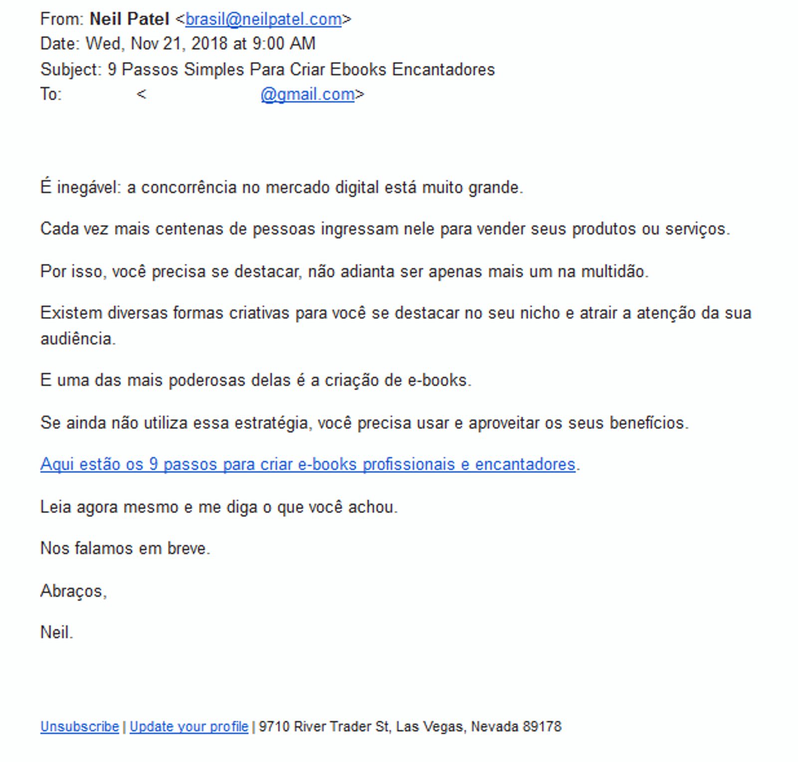 Não é preciso muito além disso para fazer um email marketing cativante. Mas perceba, os elementos principais ainda estão aí. O exemplo tem: