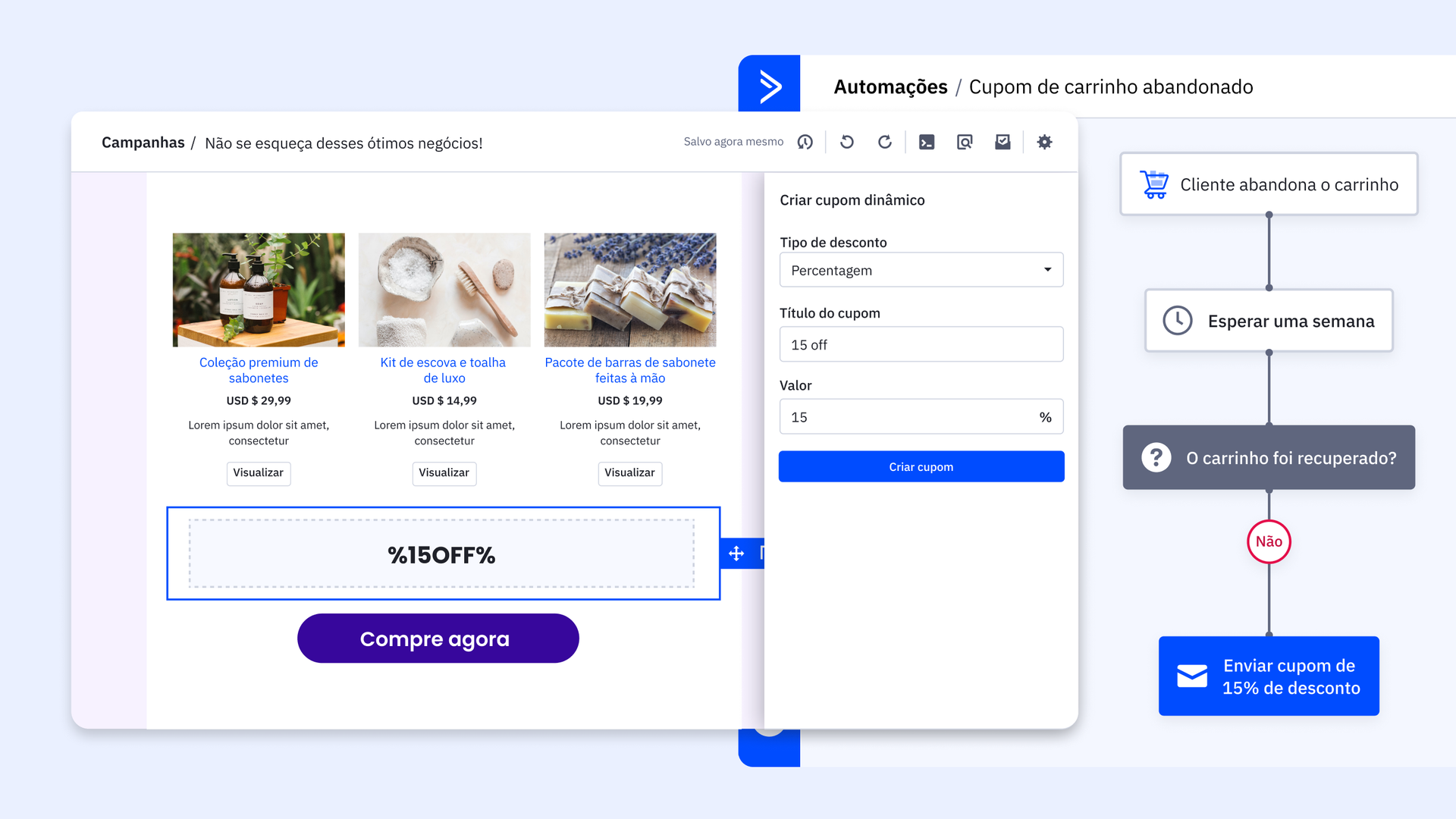 - Automações de marketing: configure sequências automatizadas que acionam emails com Blocos de cupons com base em ações ou comportamentos específicos dos clientes, como abandono de carrinho ou visualizações de produtos. Combine esses gatilhos com várias ações automatizadas para criar a estratégia mais eficaz para gerar conversões.