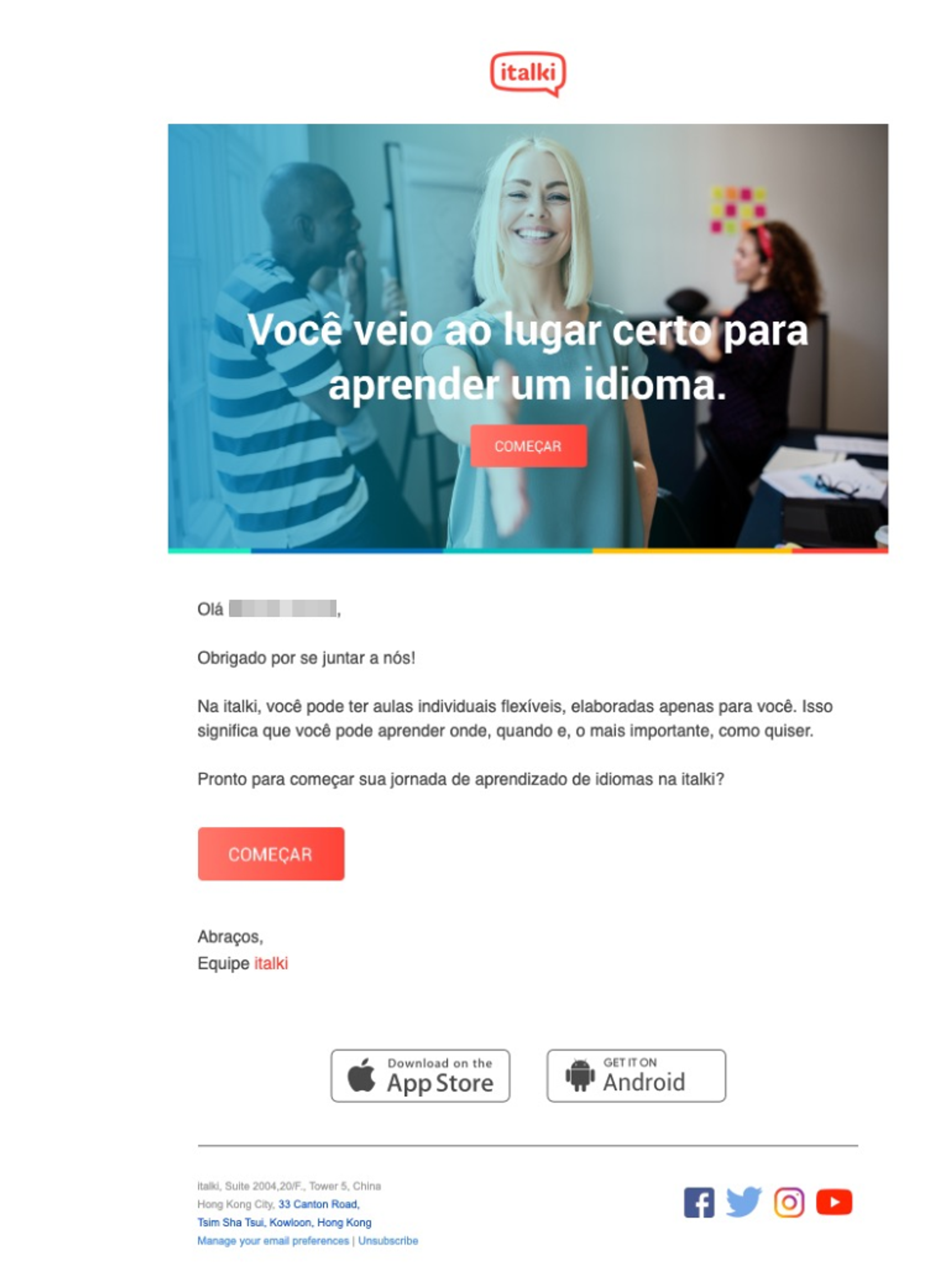 Este exemplo de email de boas-vindas da italki define bem as expectativas logo no início. Ele explica, de forma objetiva, qual a função da plataforma e o que esperar dela. Além de trazer um call to action que direciona o usuário para iniciar o seu processo de aprendizado.