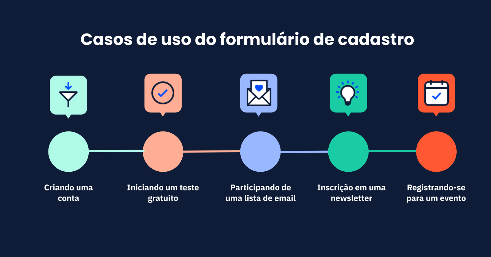 Pense no objetivo do seu formulário de cadastro. Ele será um formulário de cadastro de newsletter? Um formulário de cadastro de lista de emails? Um formulário de registro de evento?