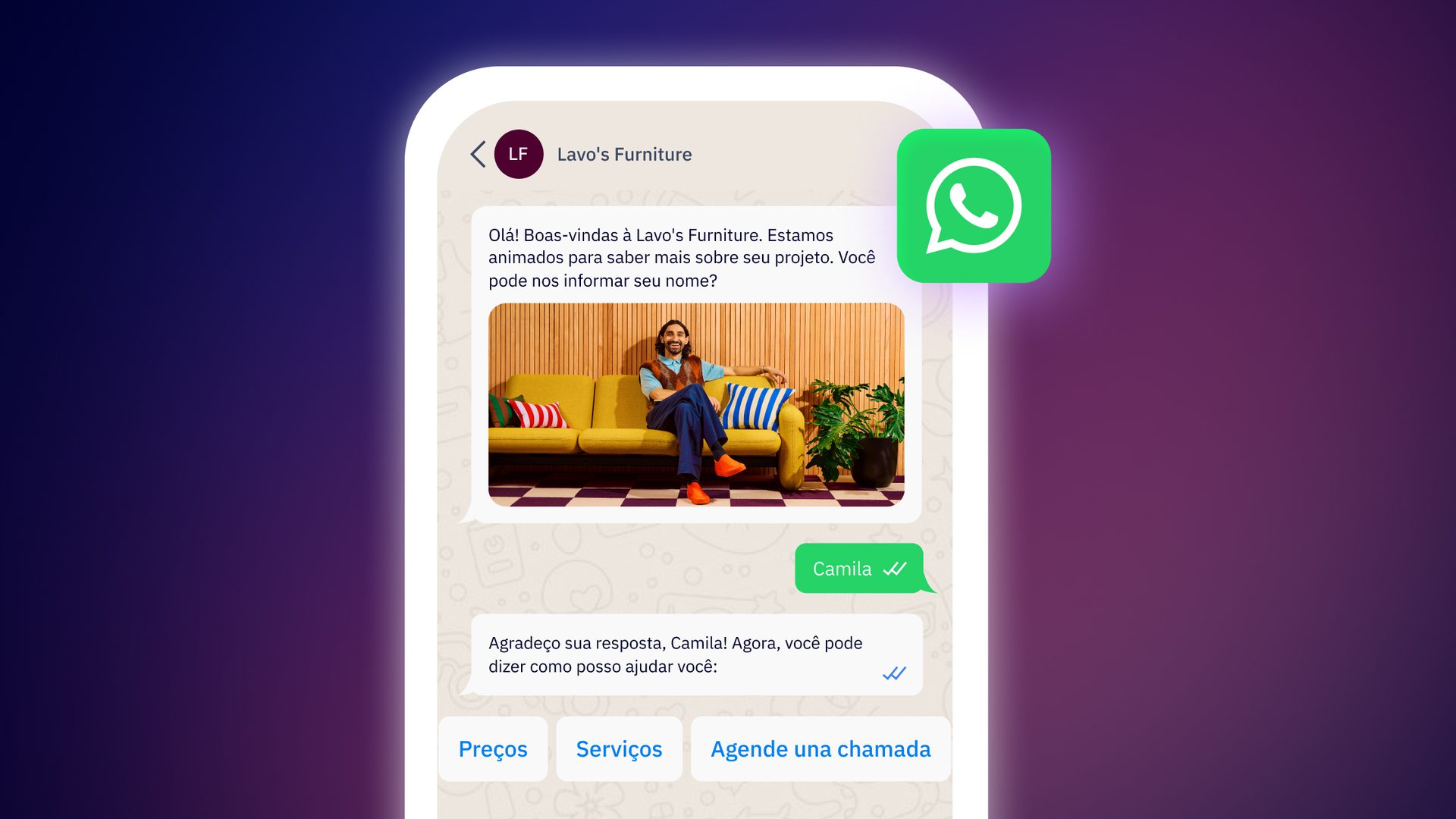 - Conscientização: entregue conteúdo protegido (página em inglês) automatizado ou séries de boas-vindas (página em inglês) para novos leads via WhatsApp.